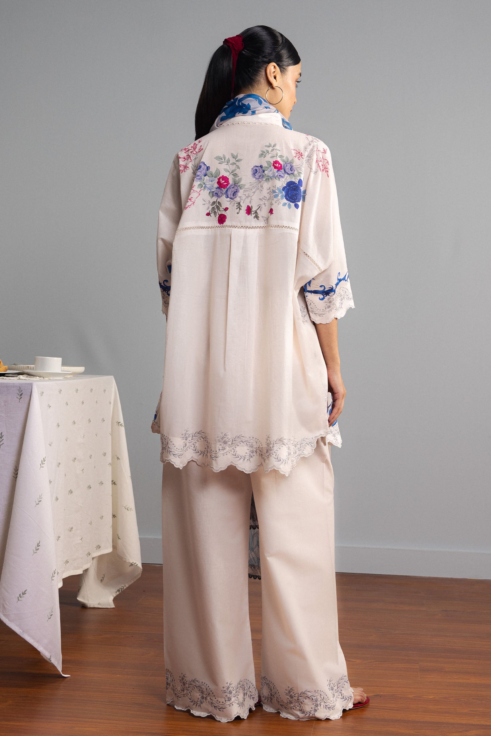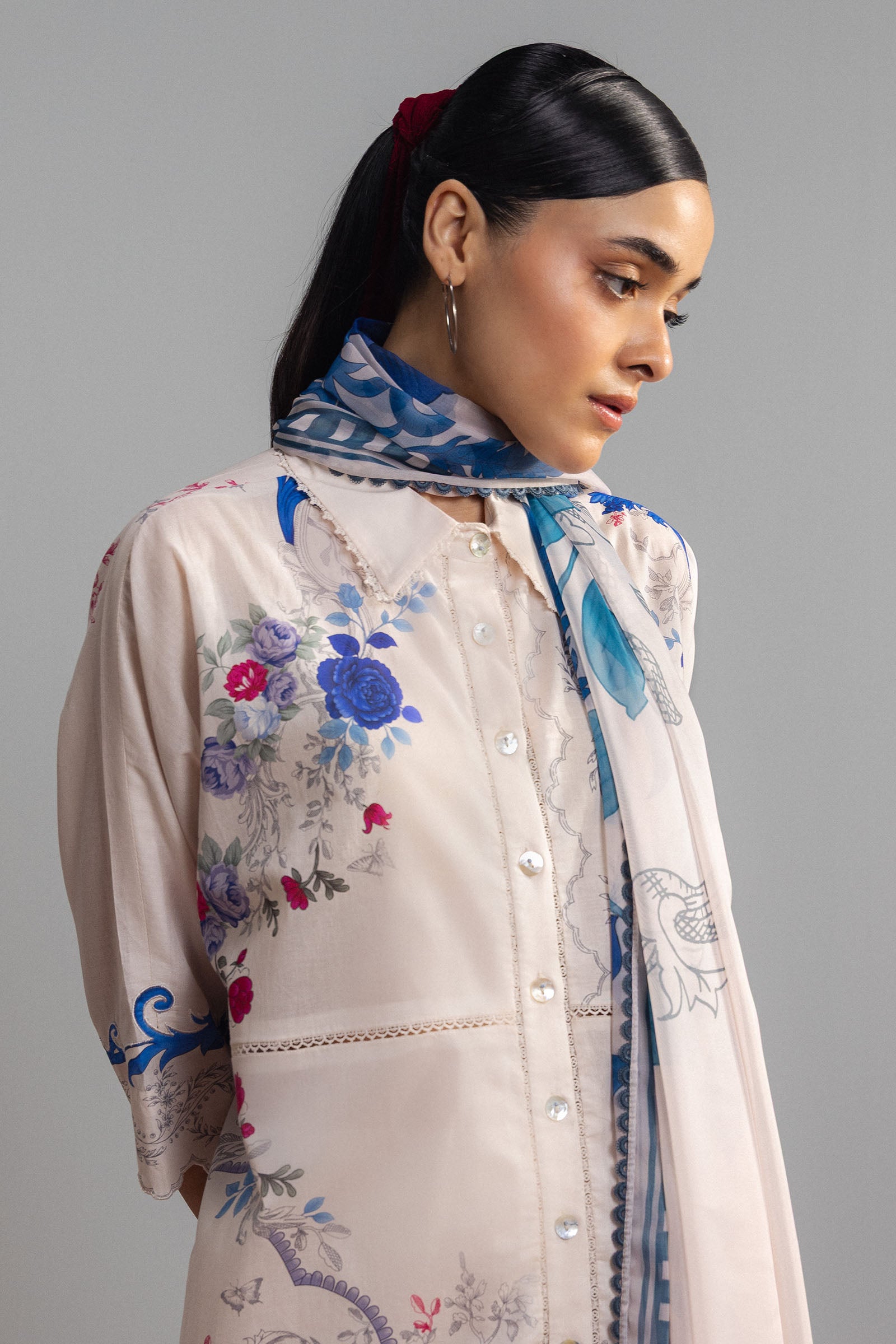 Inspired by classic porcelain tones, this off-white ensemble features striking blue florals with structured motifs. Elegant and semi-formal, it balances intricacy with understated refinement. Digital Printed Lawn Shirt 3.0 Meters