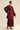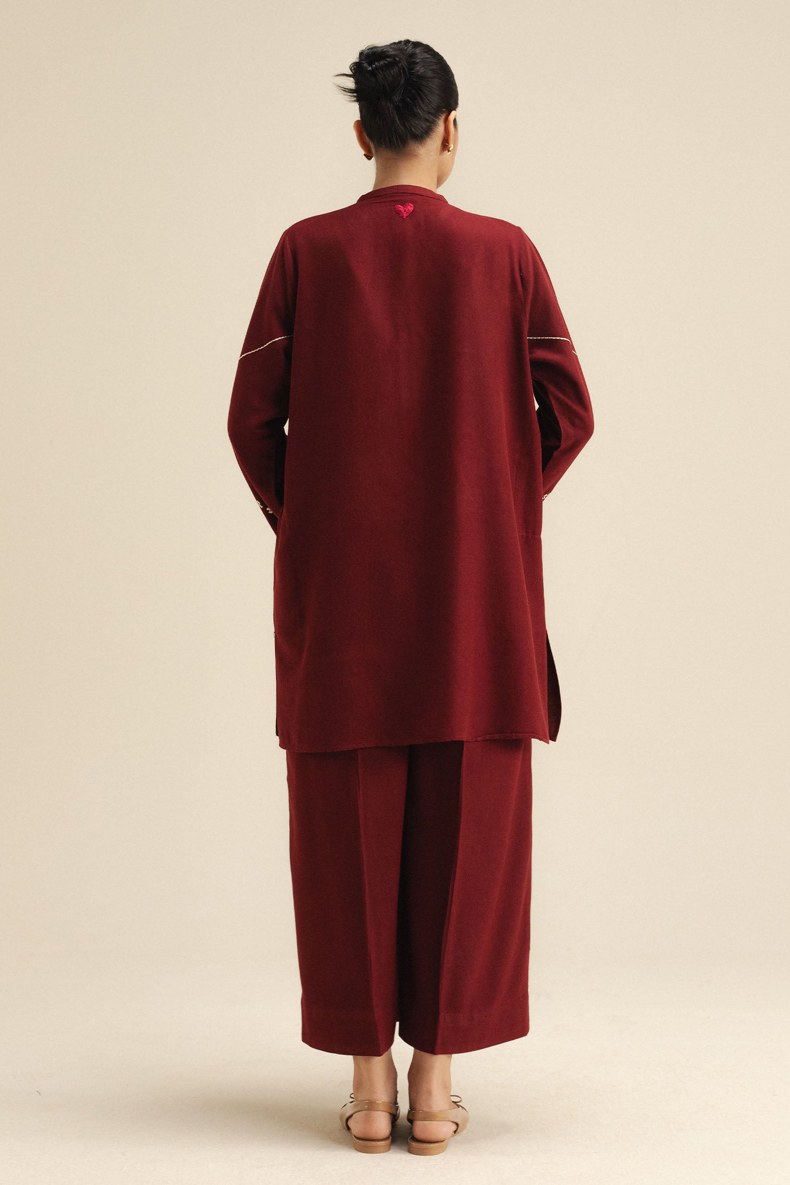 A maroon wool peach short shirt paired with a culottes, featuring intricate embroidery on the front for a sophisticated appeal.