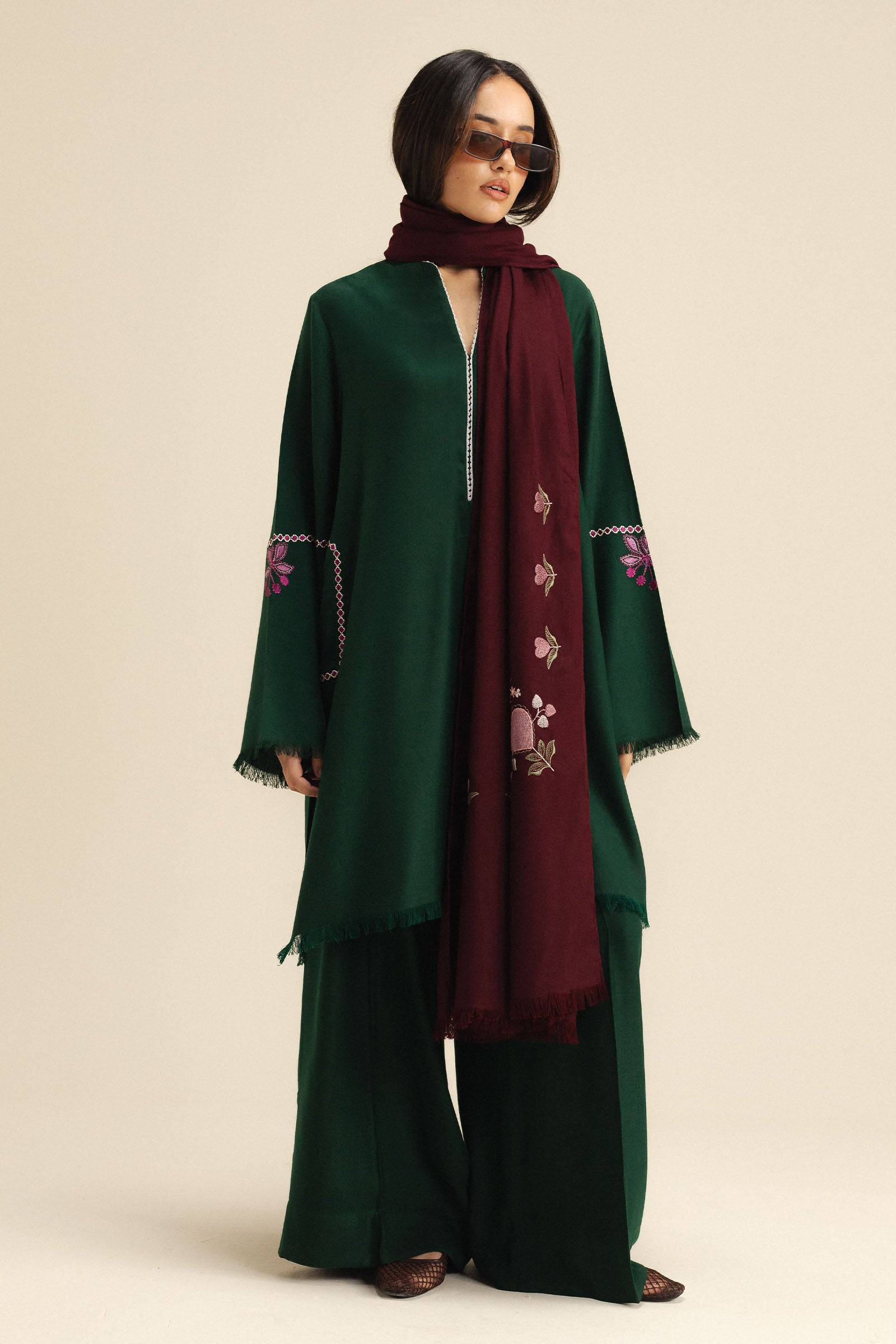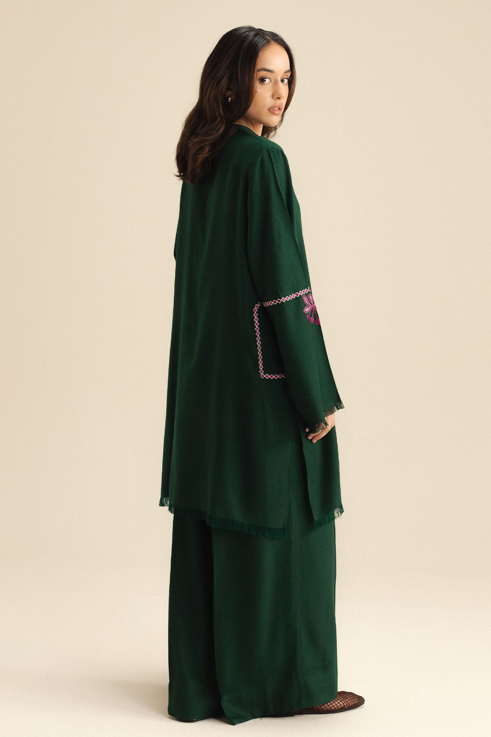 A deep green ensemble with a sleek short kurta adorned with embroidery on the sleeves and pockets, paired with wide-leg trousers for a graceful, modern look.