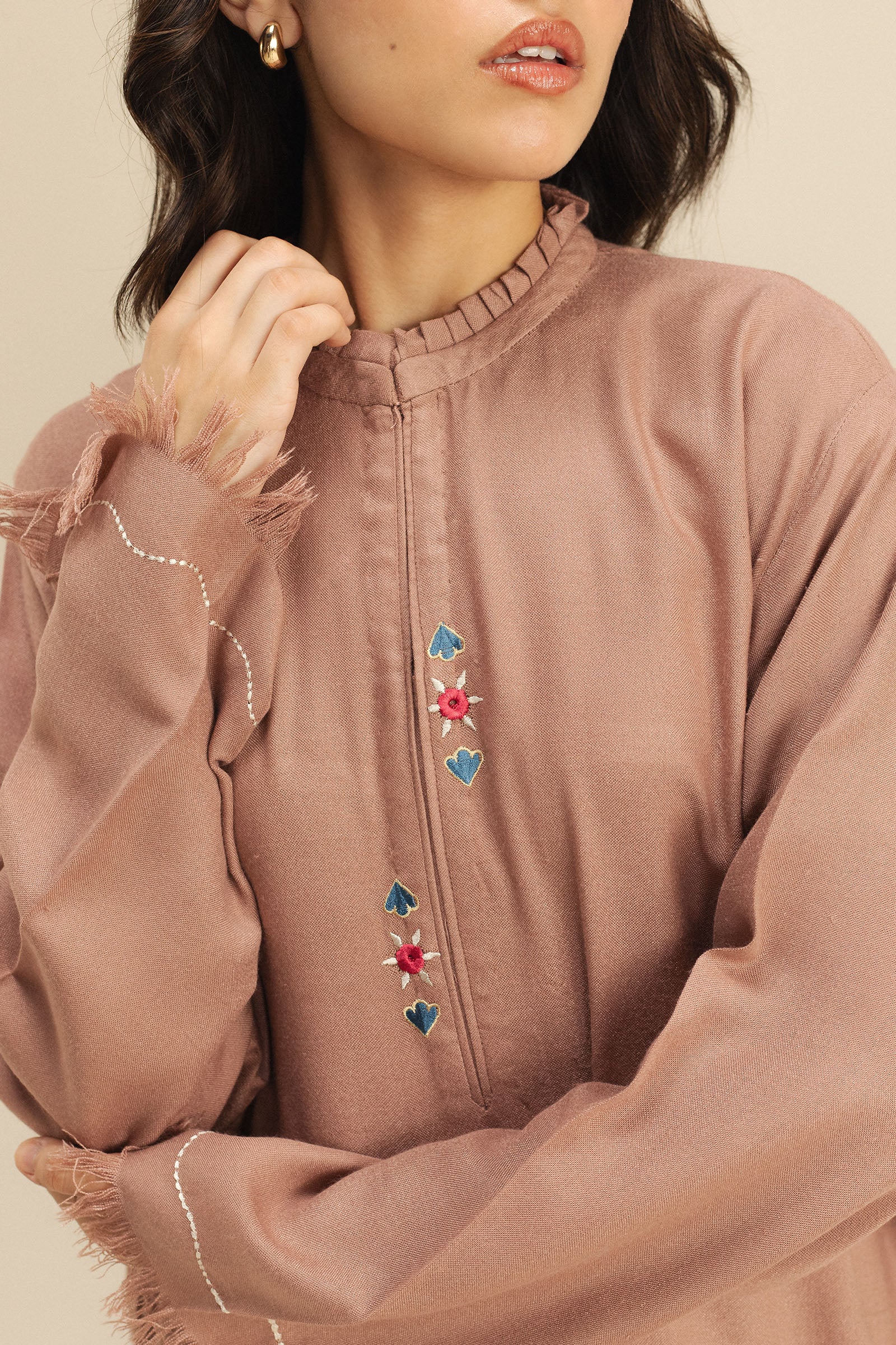 A chai pink wool peach short shirt featuring intricate embroidery details, paired with a farshi shalwar for a graceful, traditional look.