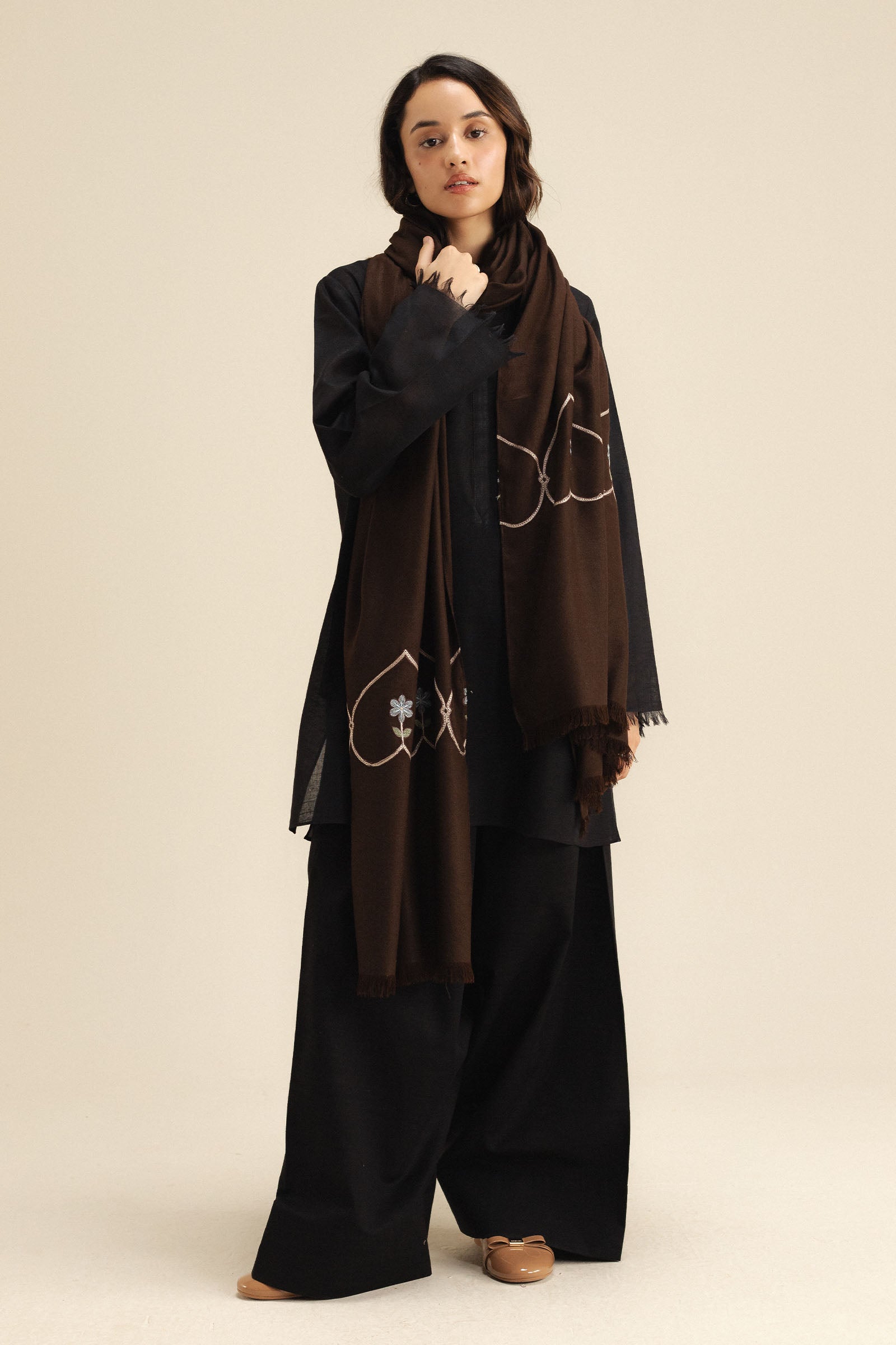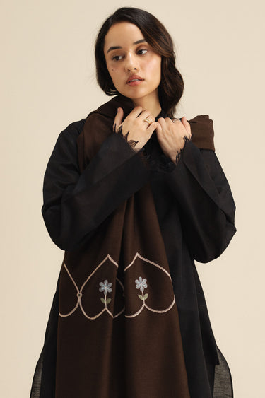 A brown wool peach shawl featuring heart-shaped embroidery on the pallu, a versatile piece to pair with any outfit.