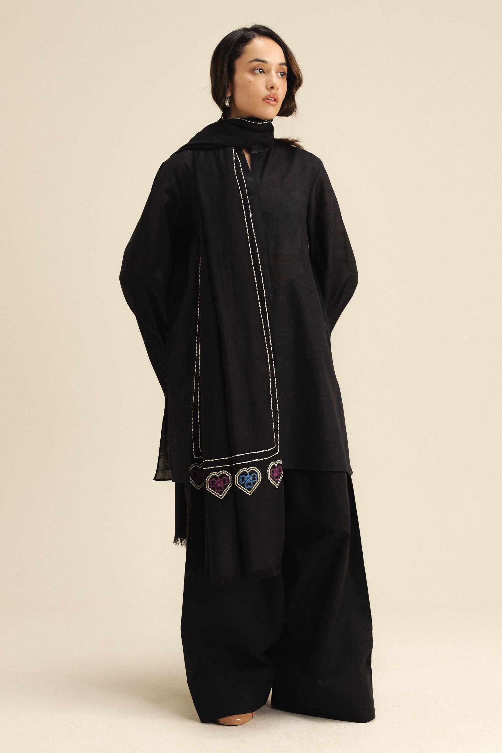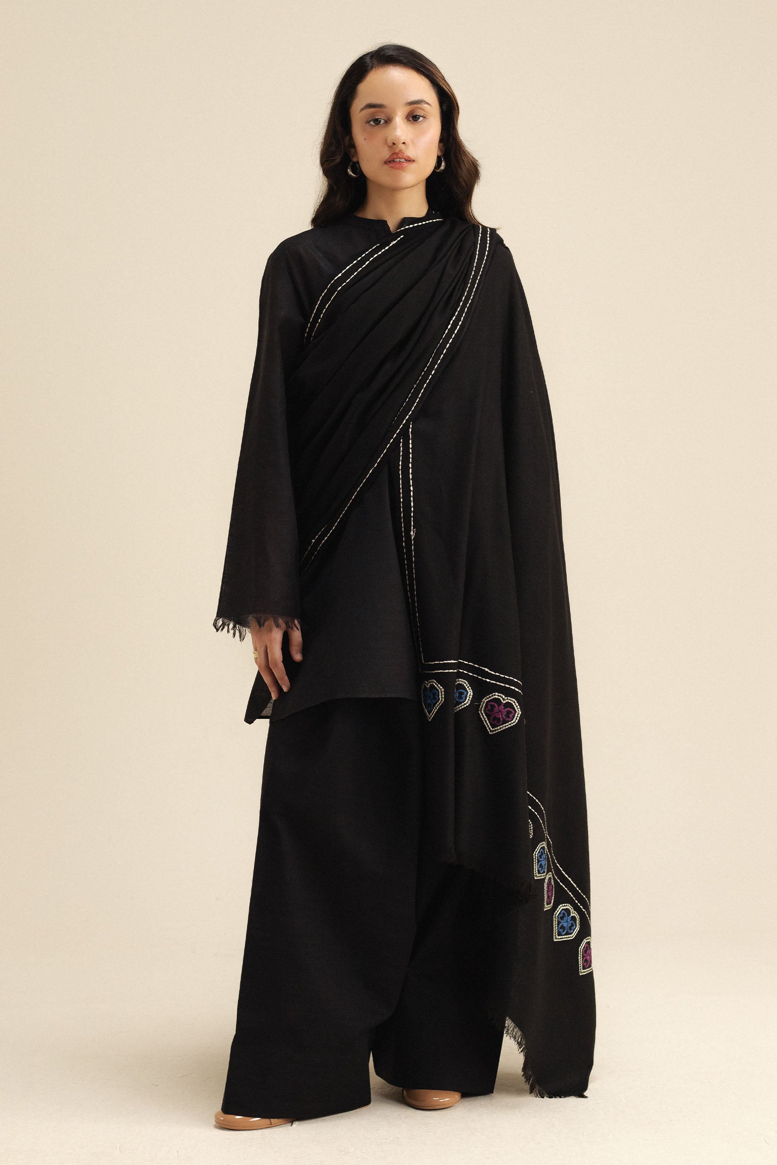 A black wool peach shawl embroidered in marganta, blue, and white tones, perfect to complement any ensemble.