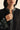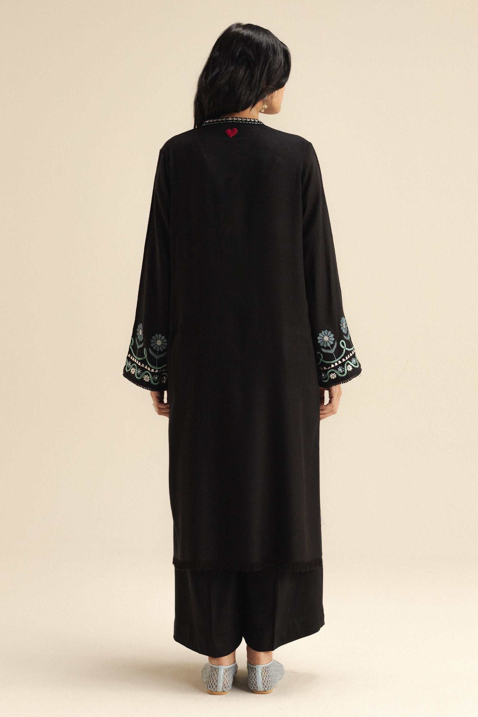A refined black wool peach long shirt accented with delicate embroidery on the sleeves and neckline, paired with culottes for a sleek silhouette.