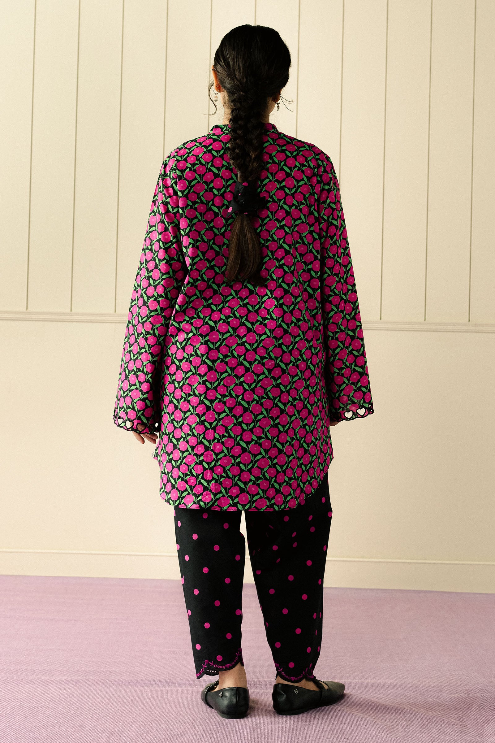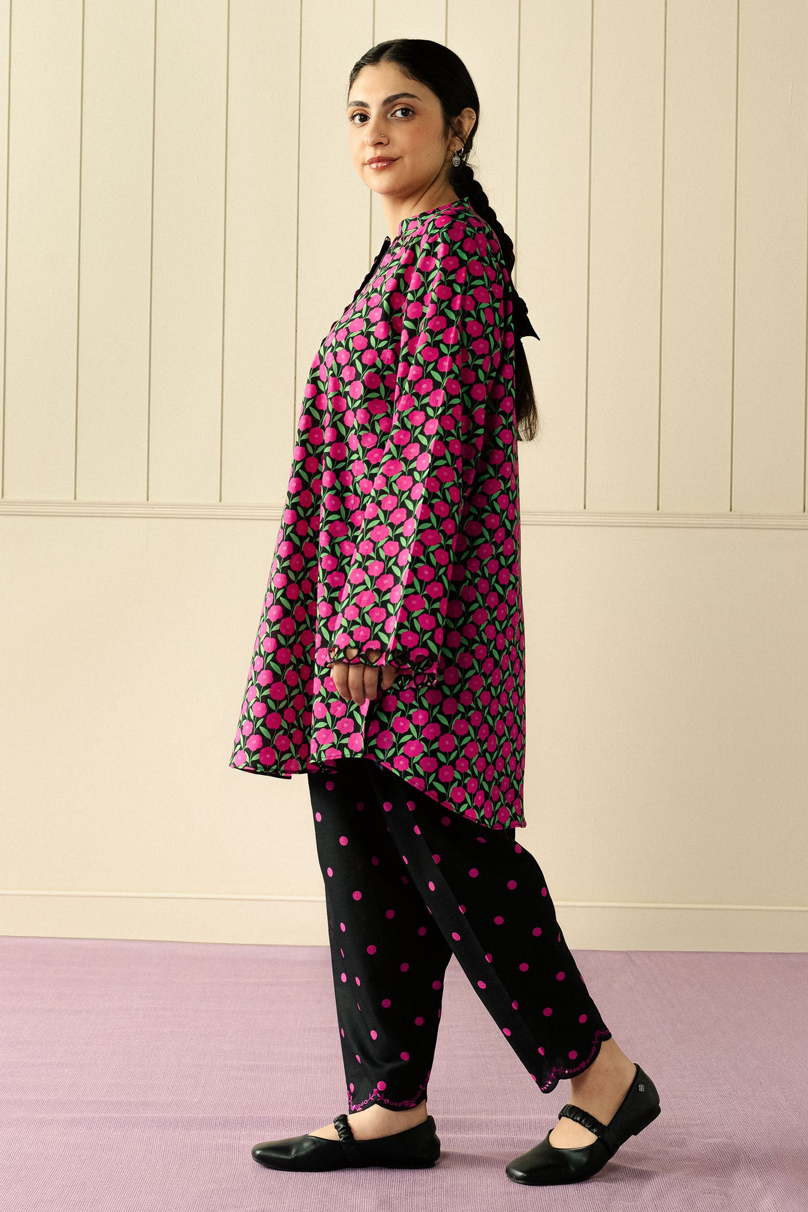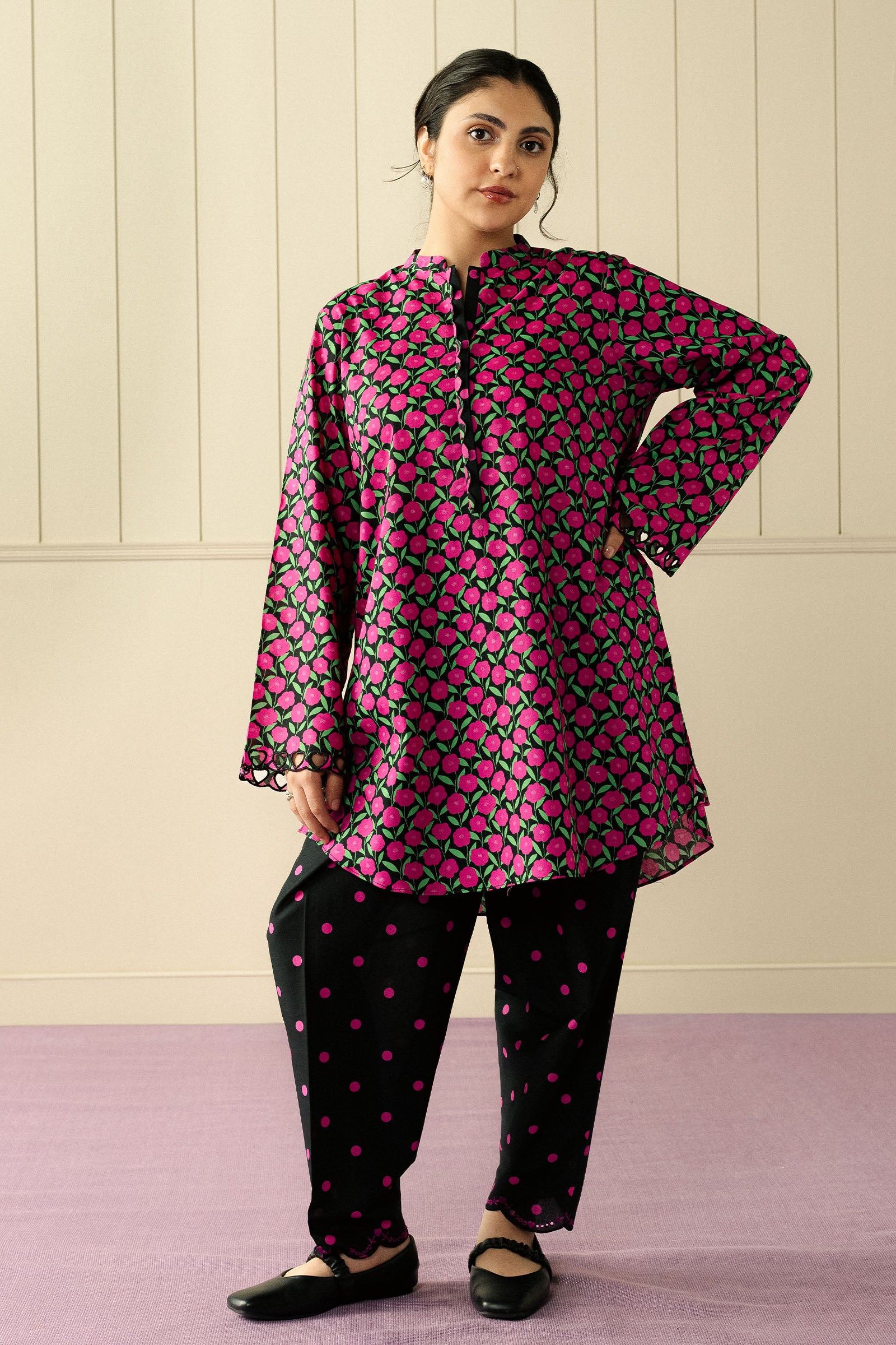 A loose-fit, short cambric kurta featuring tonal embroidery on the sleeves, paired with tapered cambric shalwar. Effortless and thoughtfully detailed, this look balances classic charm with a contemporary, playful energy — perfect for easy, stylish days.
