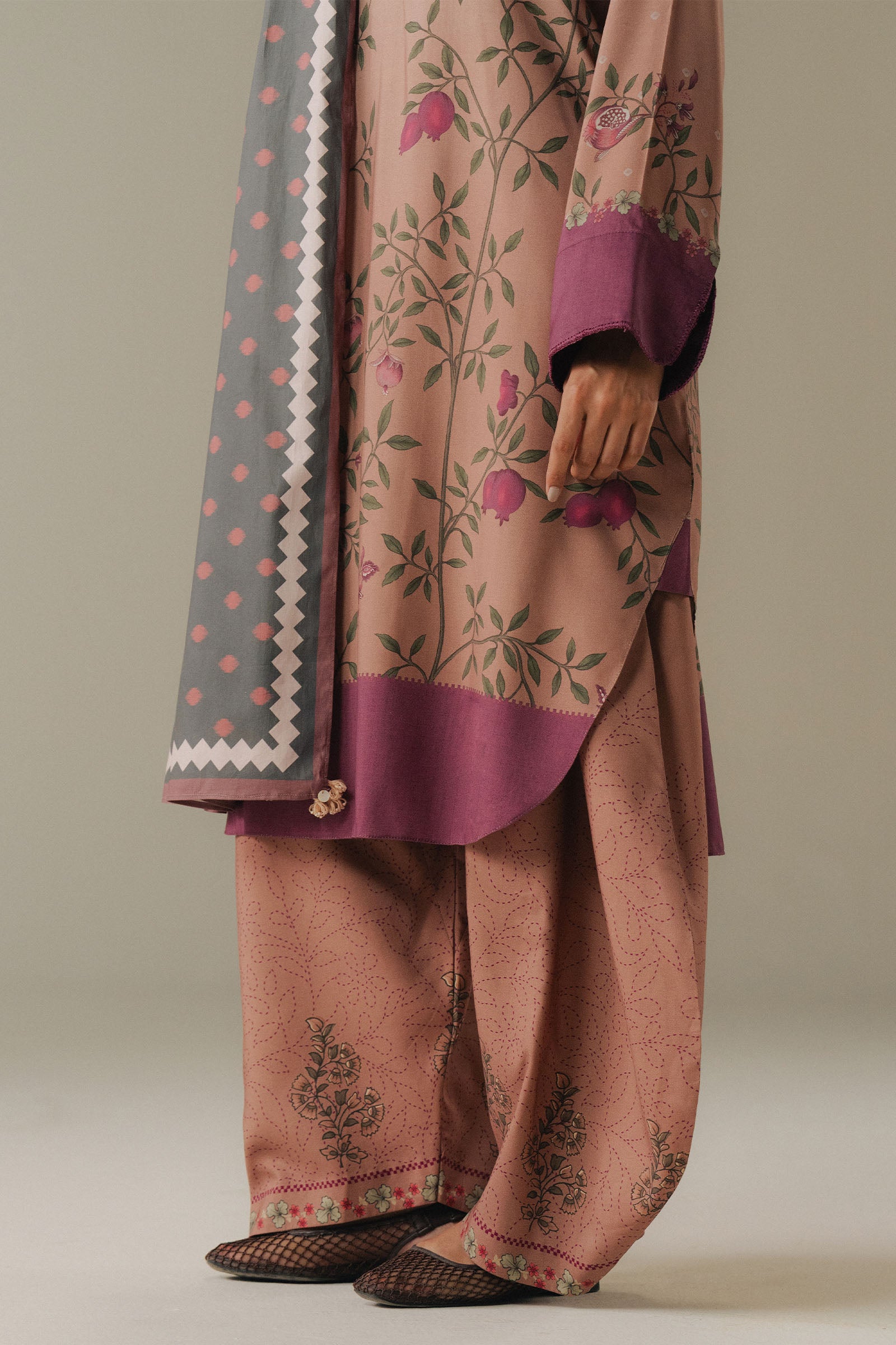 A dusty pink shirt inspired by modern chintz patterns, paired with matching dusty pink trousers featuring delicate block print details. The ensemble is beautifully complemented by a shawl in soft shades of gray and pink, creating a refined, feminine, and effortlessly graceful look.