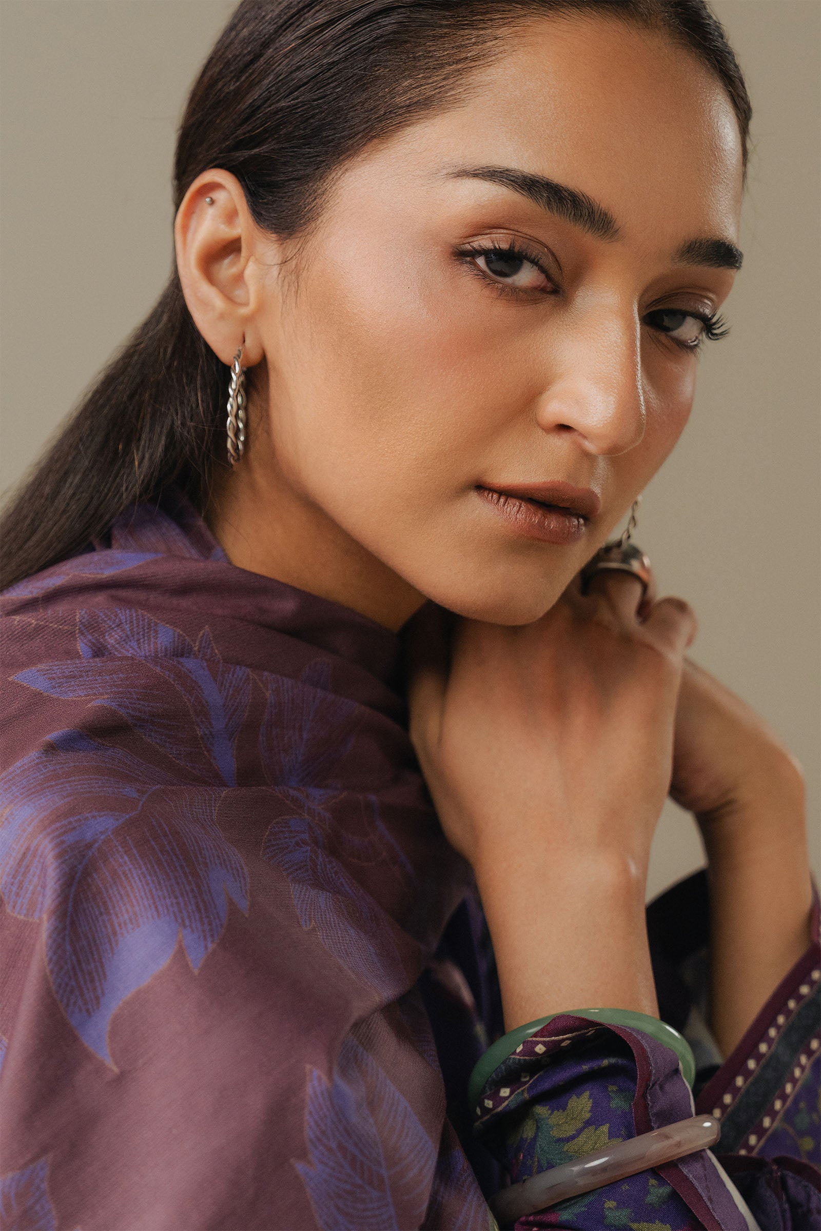 An aubergine shirt inspired by classic chintz floral patterns, paired with matching aubergine trousers featuring a blend of oggy motifs and chintz-inspired details. The look is completed with a self-aubergine shawl, creating a rich, monochromatic ensemble that exudes sophistication and timeless charm.