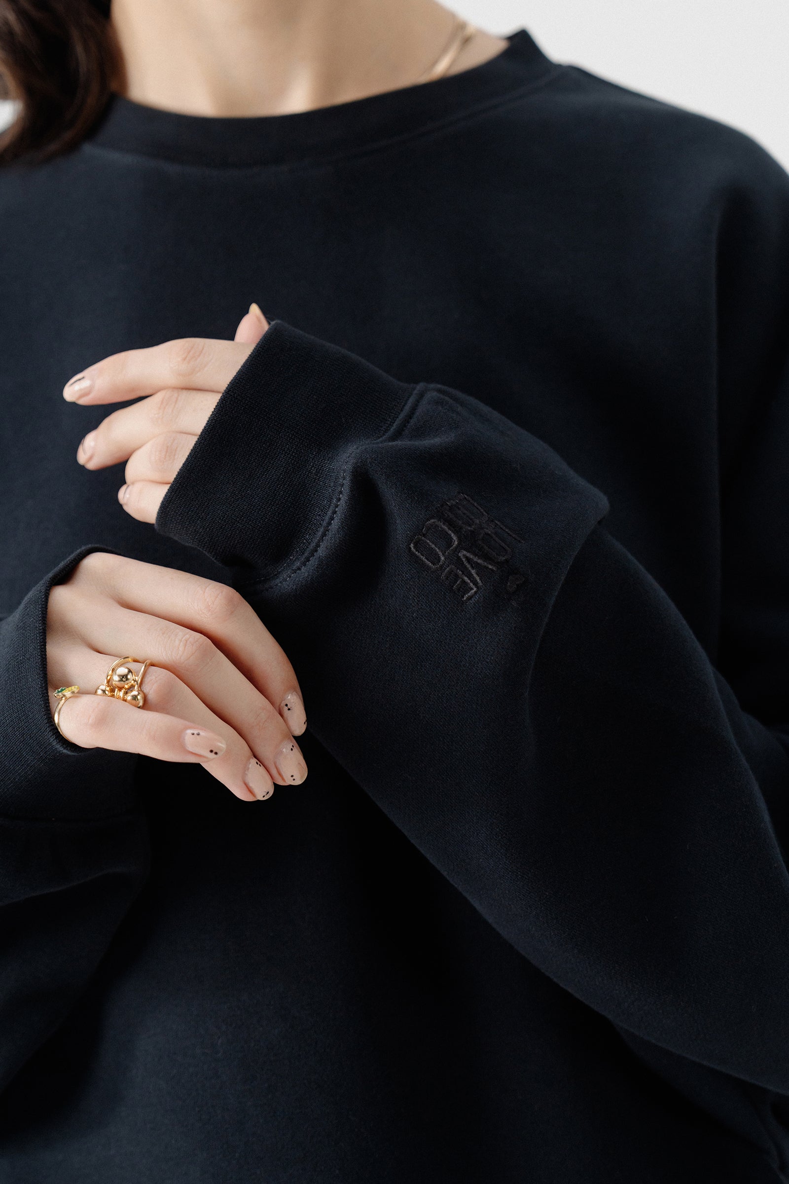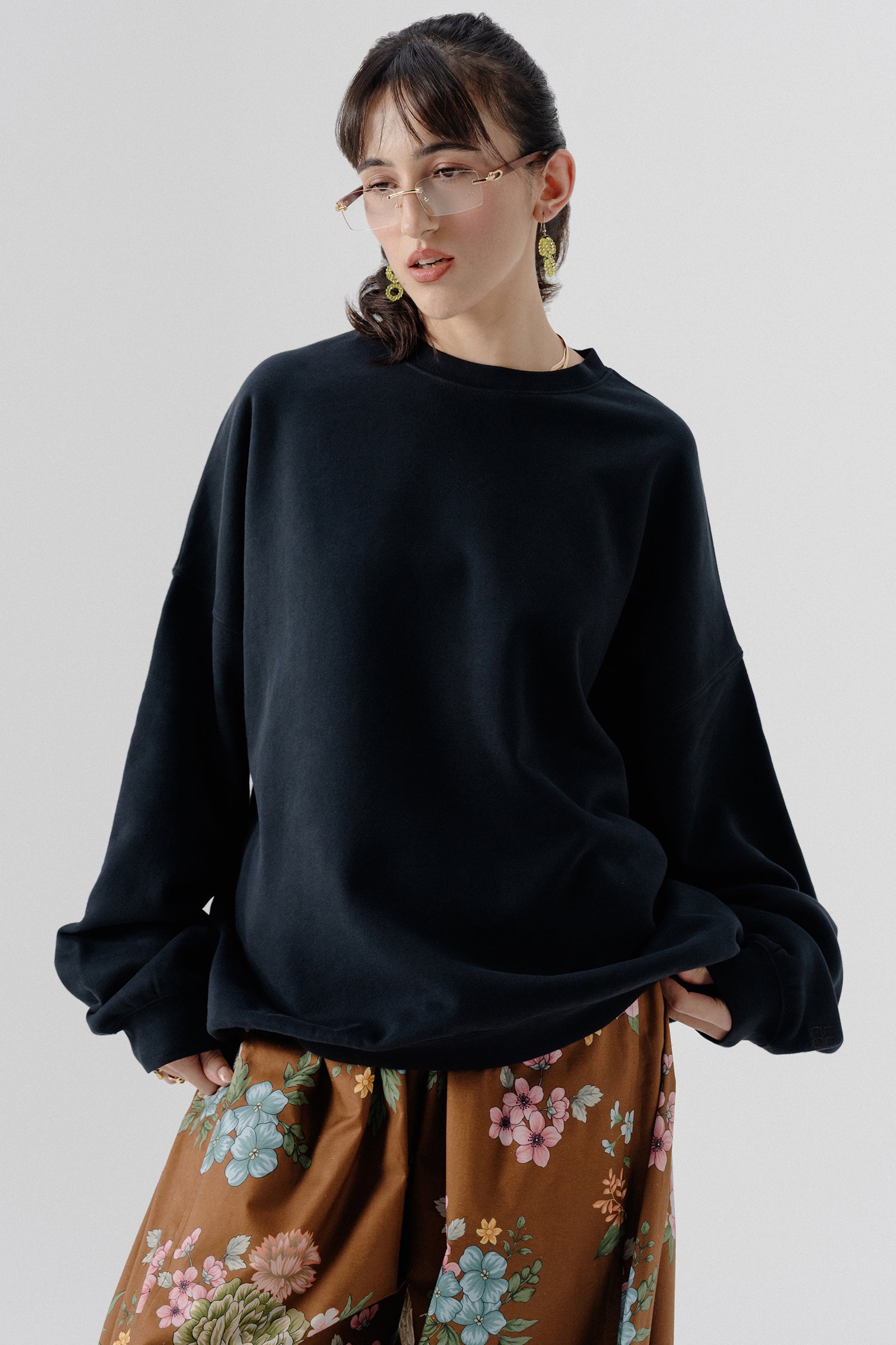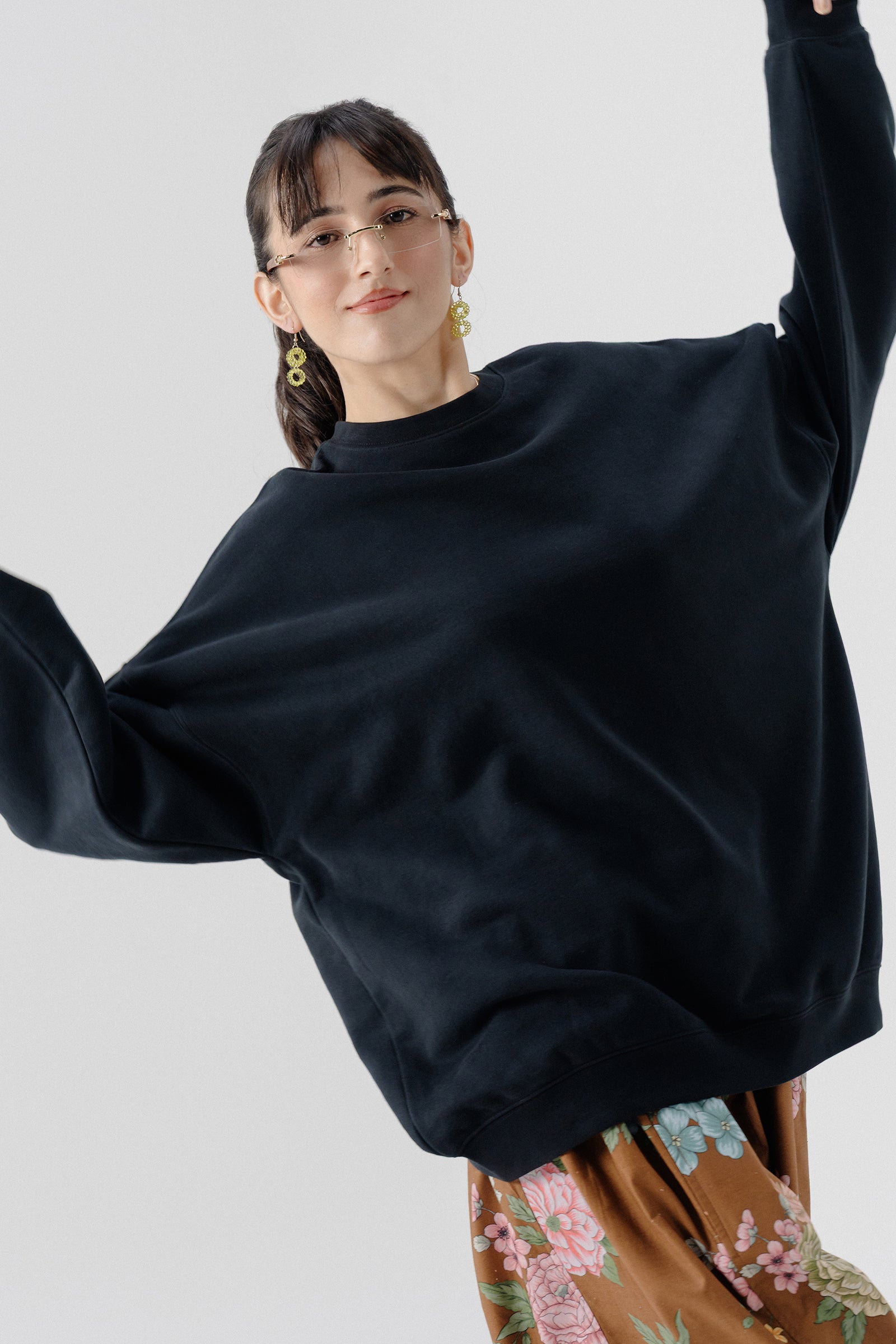 This Soft Oversized Sweatshirt is crafted from soft fleece peach fabric, providing cozy warmth and effortless comfort. The deep black shade gives it a versatile, classic appeal, while subtle sleeve detailing adds a refined touch. Designed in a relaxed, one-size fit, it drapes beautifully and pairs seamlessly with everything from casual denim to elevated bottoms.