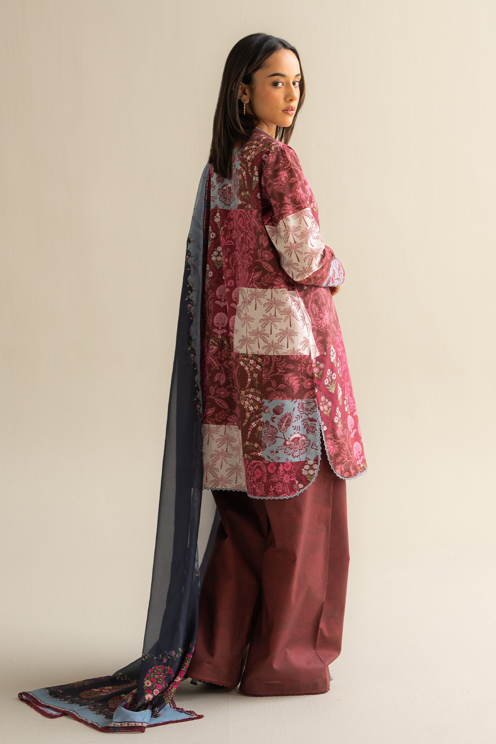 Patchwork-inspired burgundy shirt and pants, paired with a rich silk dupatta—artful, warm, and full of texture.