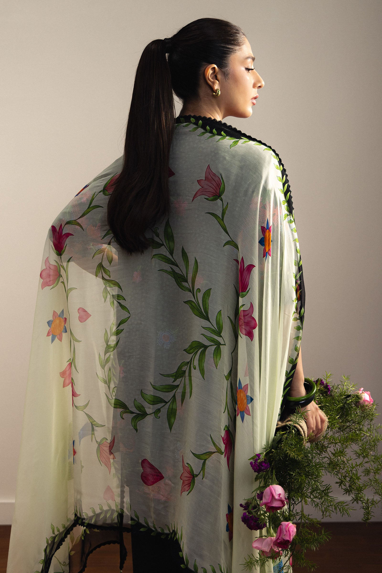 A bold, high-contrast design where vibrant florals and birds bloom over a dramatic black canvas. Accents of fuchsia, coral, and emerald bring richness, while the sage-toned dupatta with ornate borders softens the look with a graceful finish.