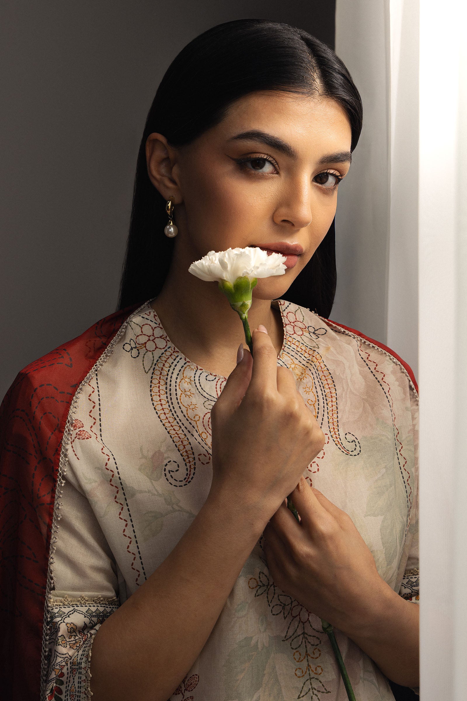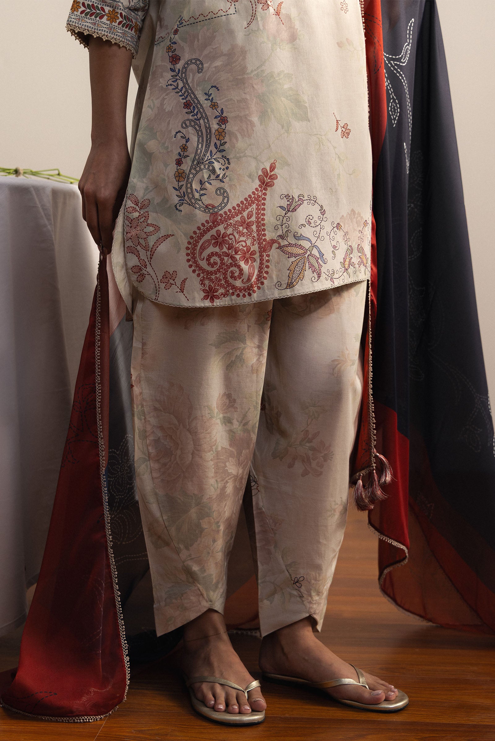 Timeless and graceful, this ivory ensemble features soft blush florals and an intricately detailed neckline. Paired with a bold black and maroon silk dupatta, it creates a refined harmony between subtle elegance and statement contrast.