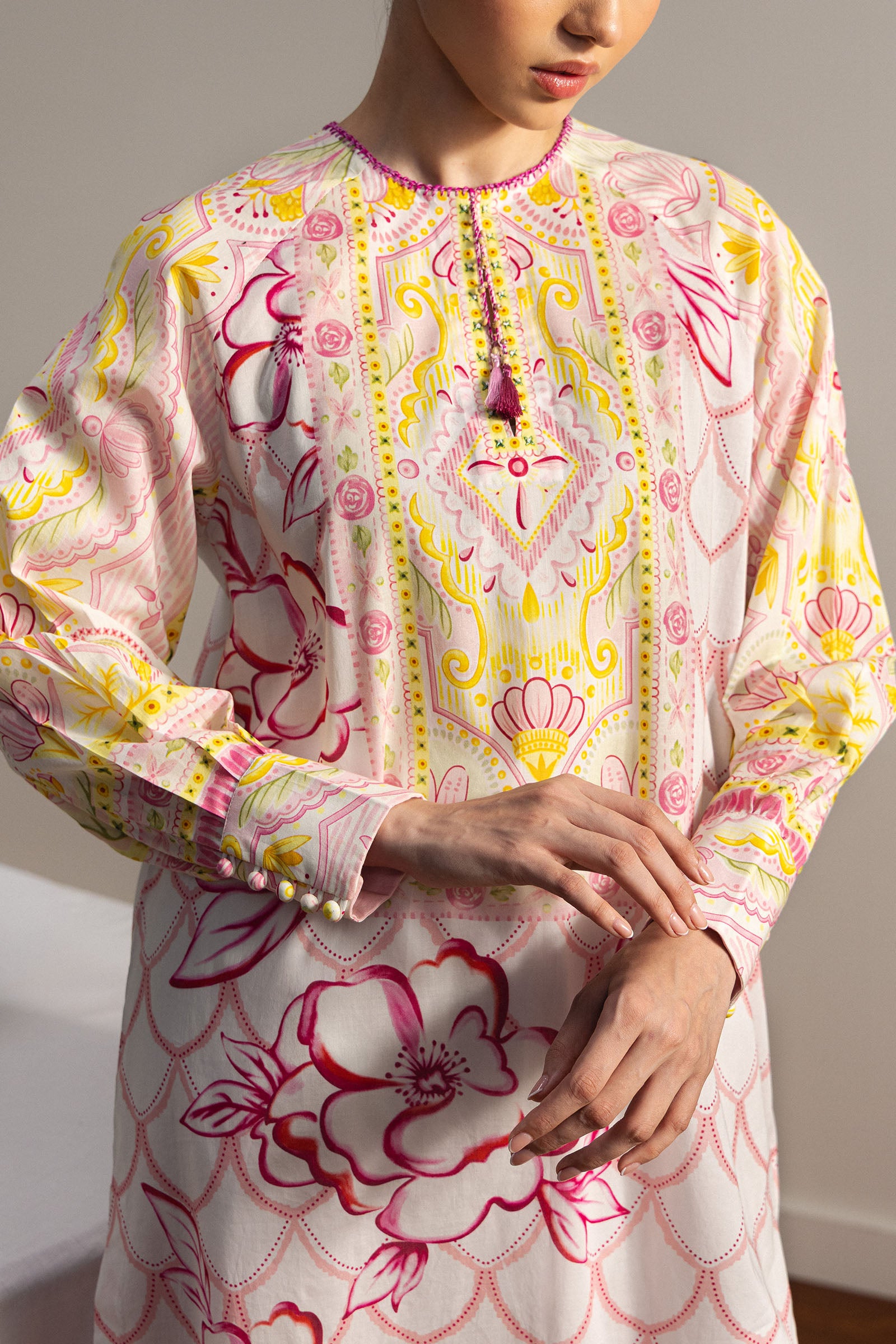 Soft blush and ivory tones come together in a delicate scalloped pattern, enhanced by pastel florals and an intricately detailed neckline. The sage and mauve dupatta adds depth while maintaining the overall softness.