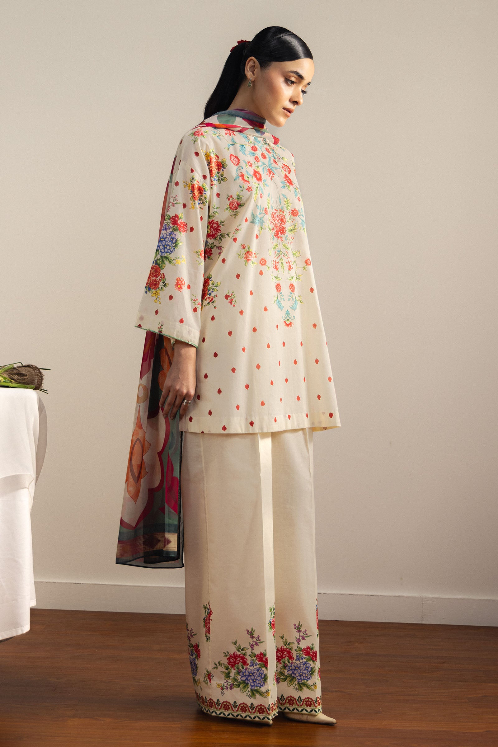 A warm beige base meets traditional floral bouquets in a symmetrical layout. The silk dupatta, rich with folk-inspired motifs, introduces a vibrant contrast to this otherwise classic and grounded design.
