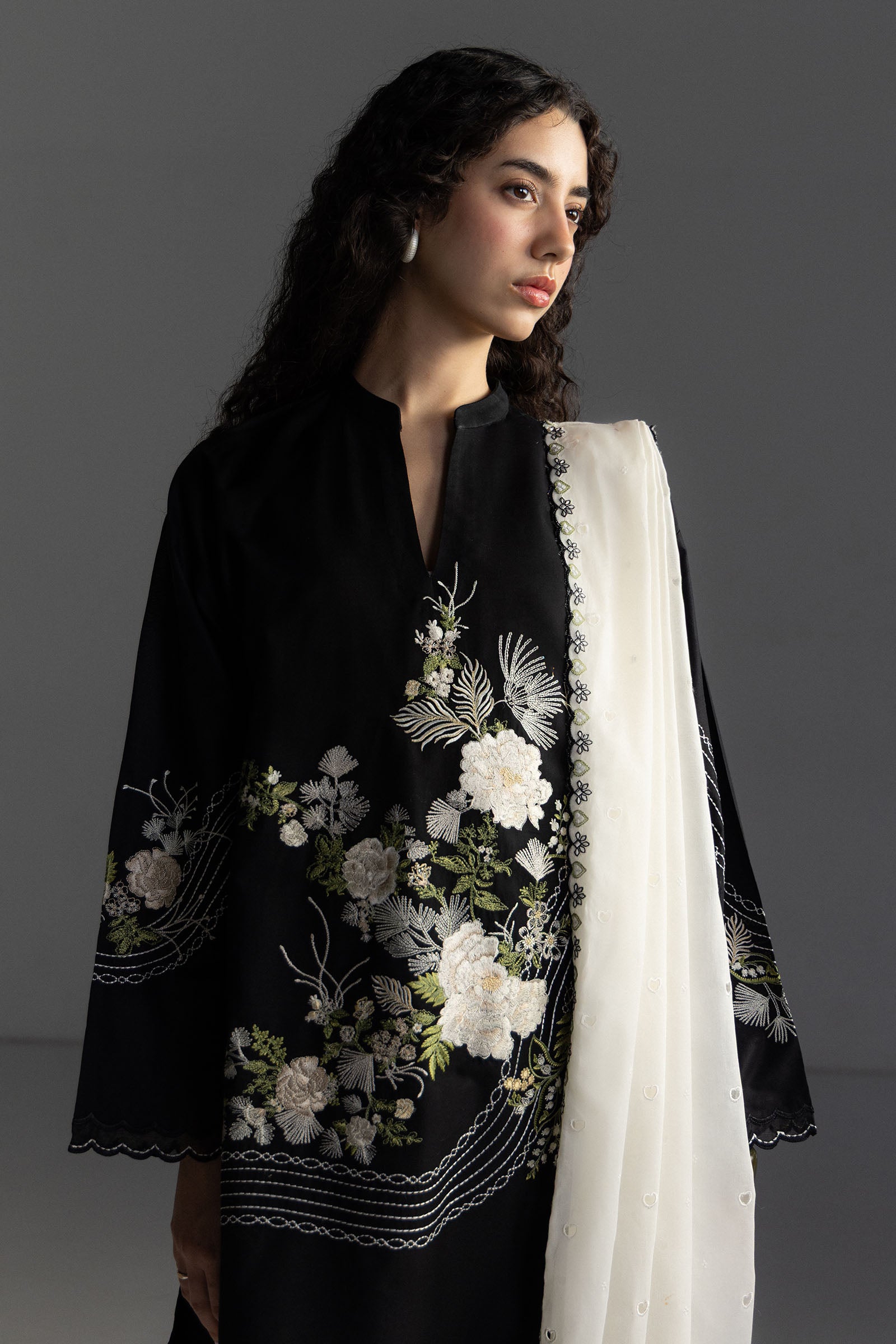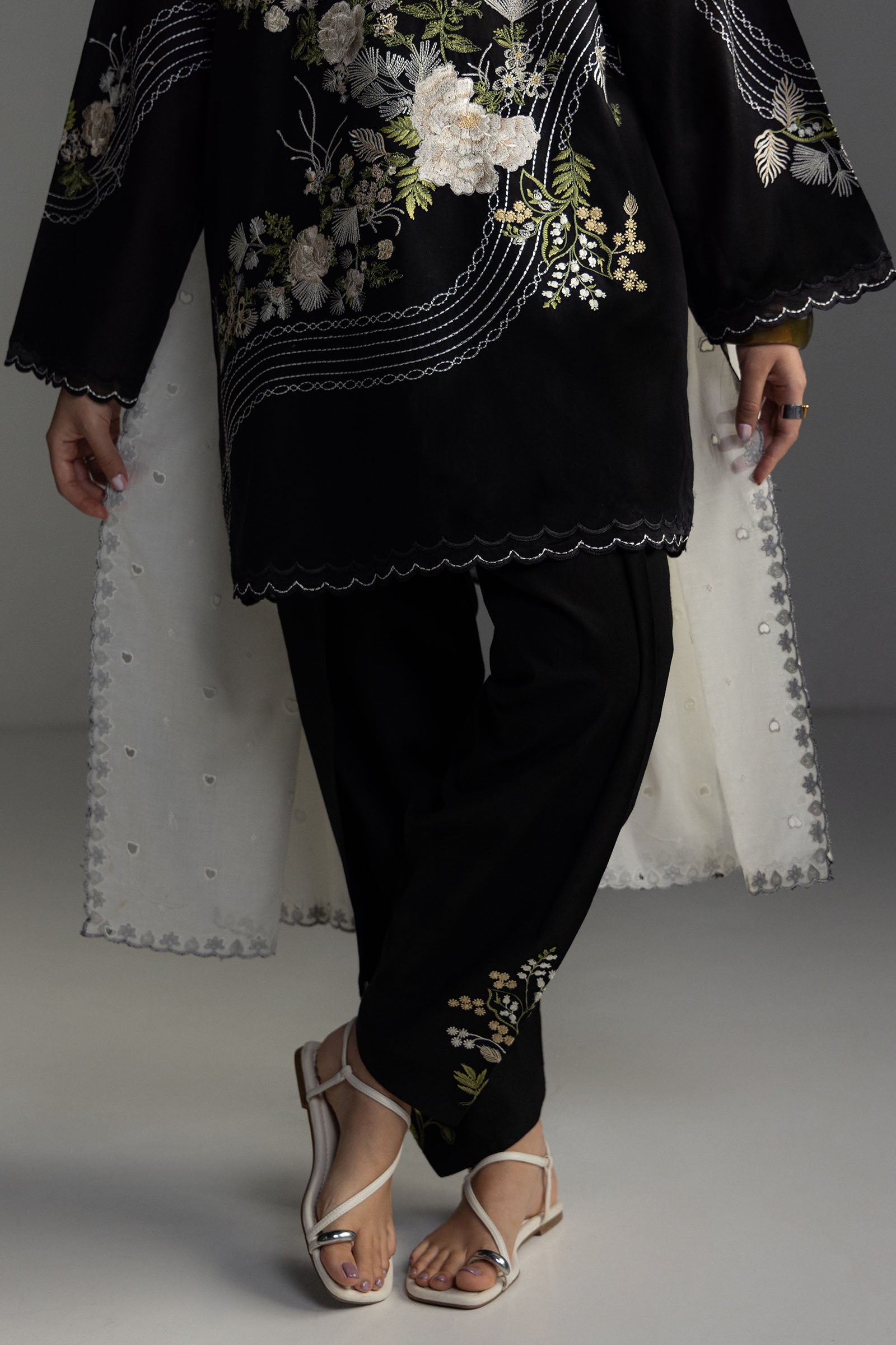 A black shirt with Japanese floral embroidery, paired with a dyed black trouser, and finished with a chikankari embroidered pearl white dupatta for a refined, statement making ensemble.