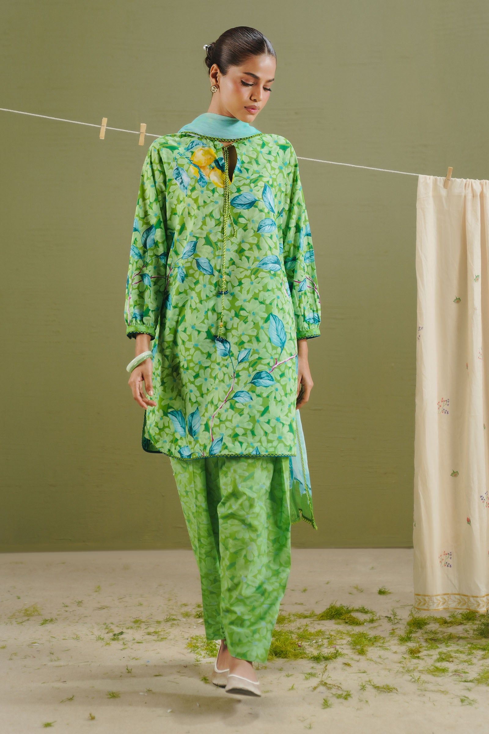 The dupatta presents daisy florals with a watercolor-textured effect in aqua marine tones. The shirt and trouser are printed with daisy meadow inspired motifs on a pear green base.
