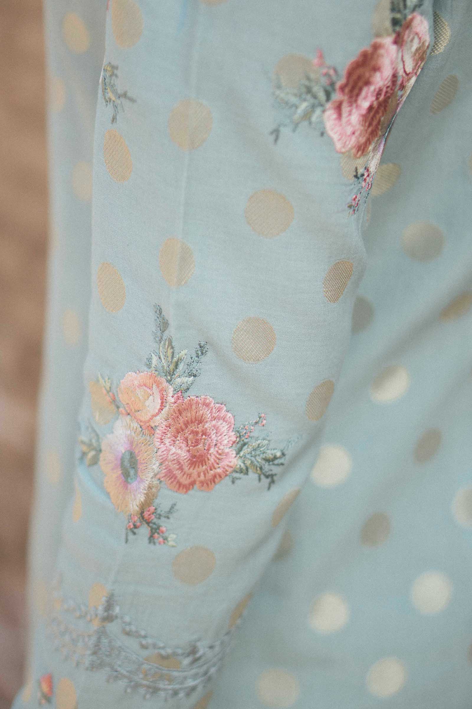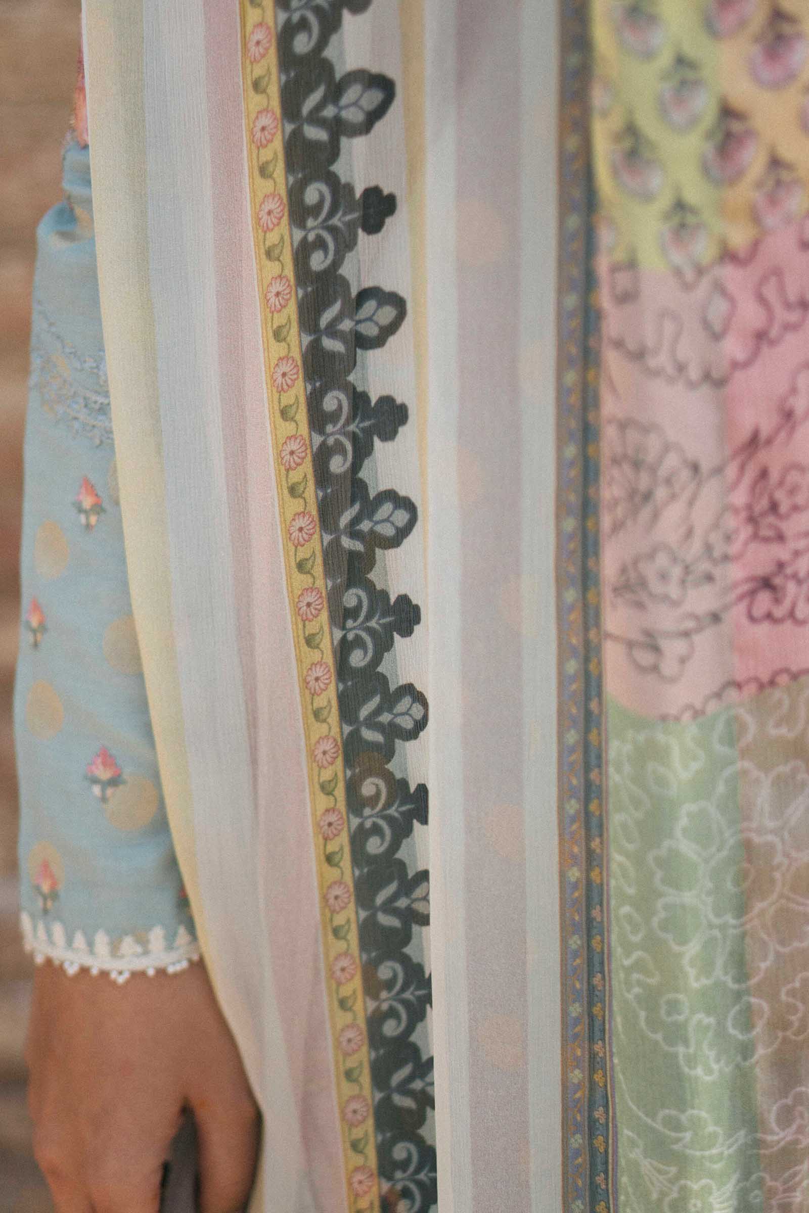An aqua straight cut panelled kurta with an embroidered neckline, sleeves, corner motives and hemline, paired with our appliqued embroidered shalwar and a printed chiffon dupatta