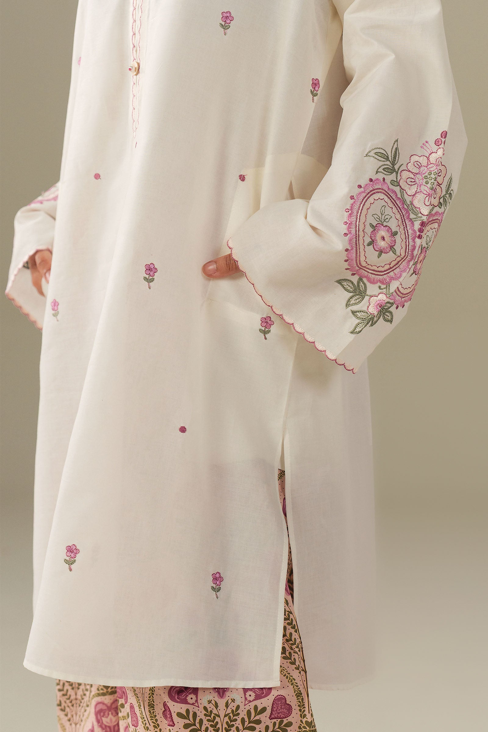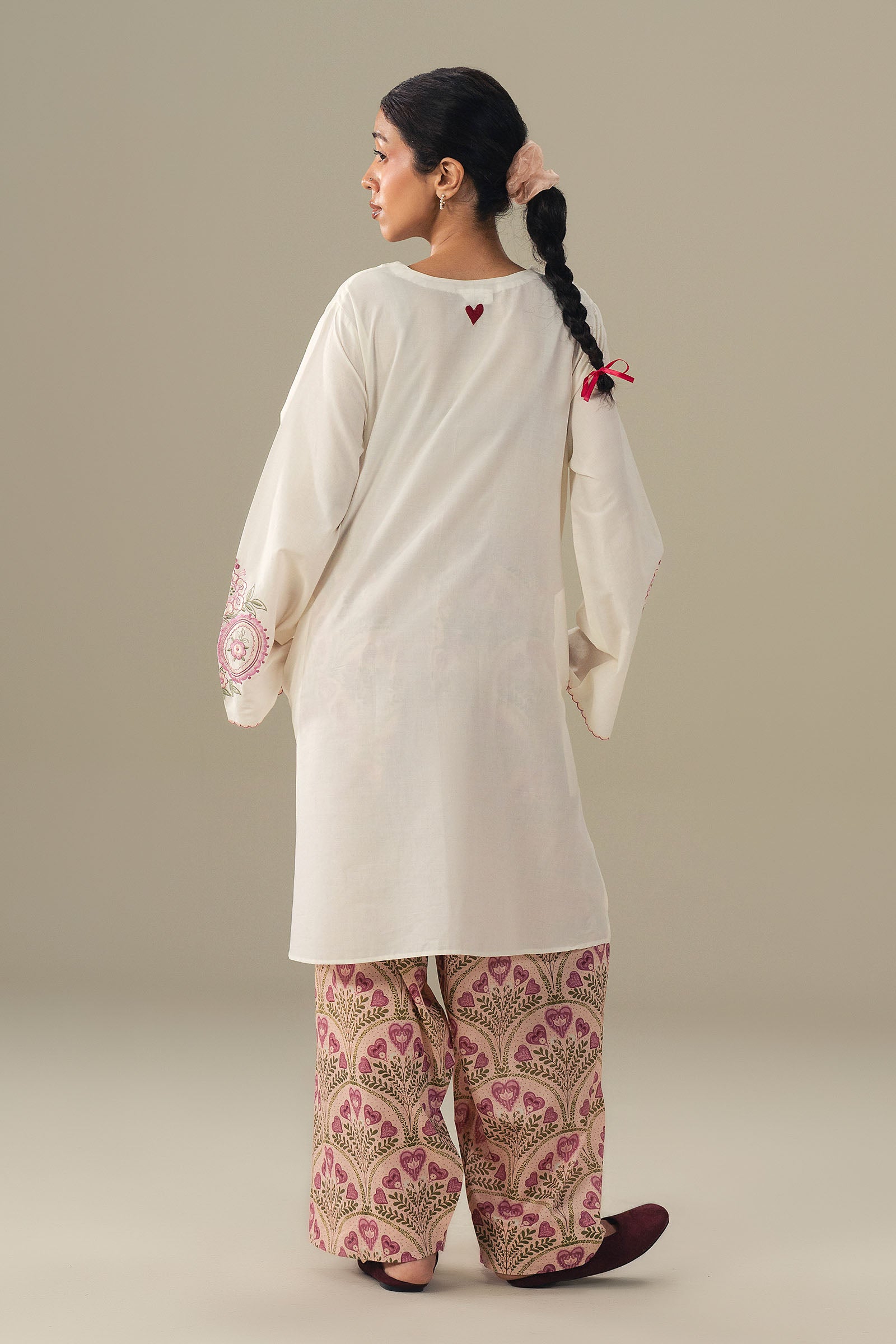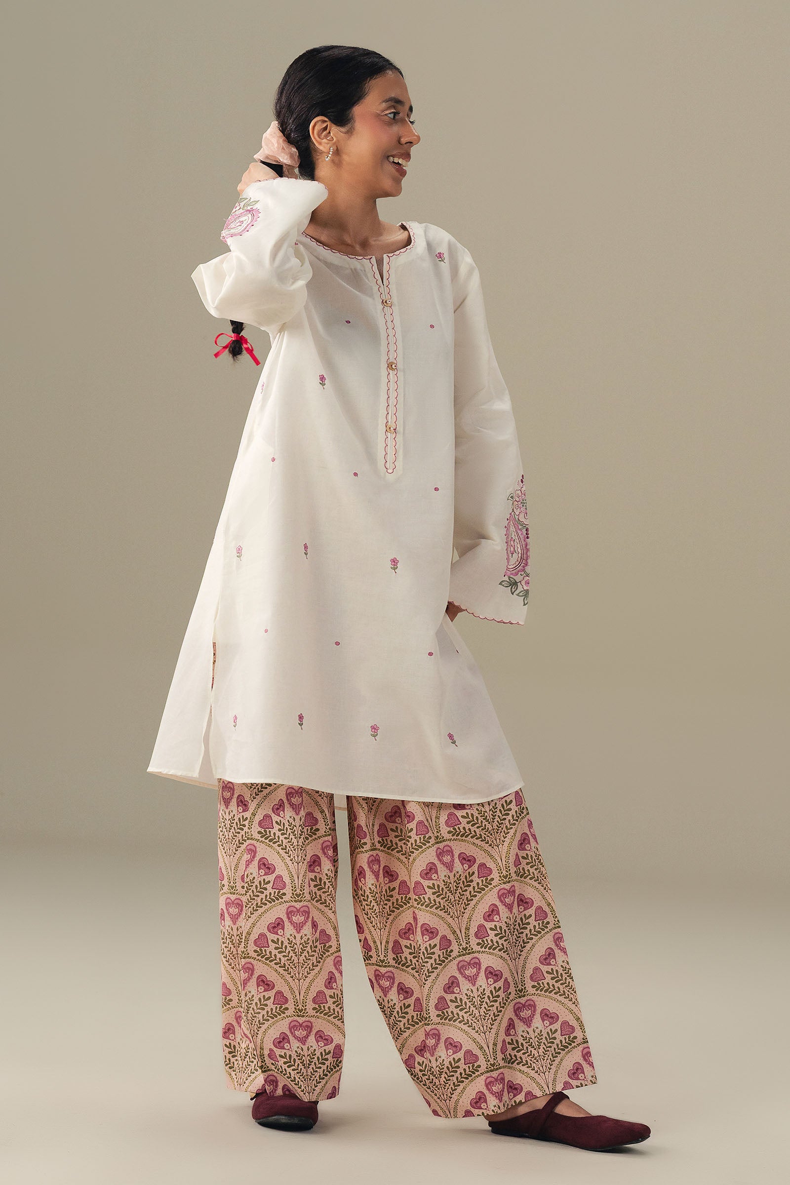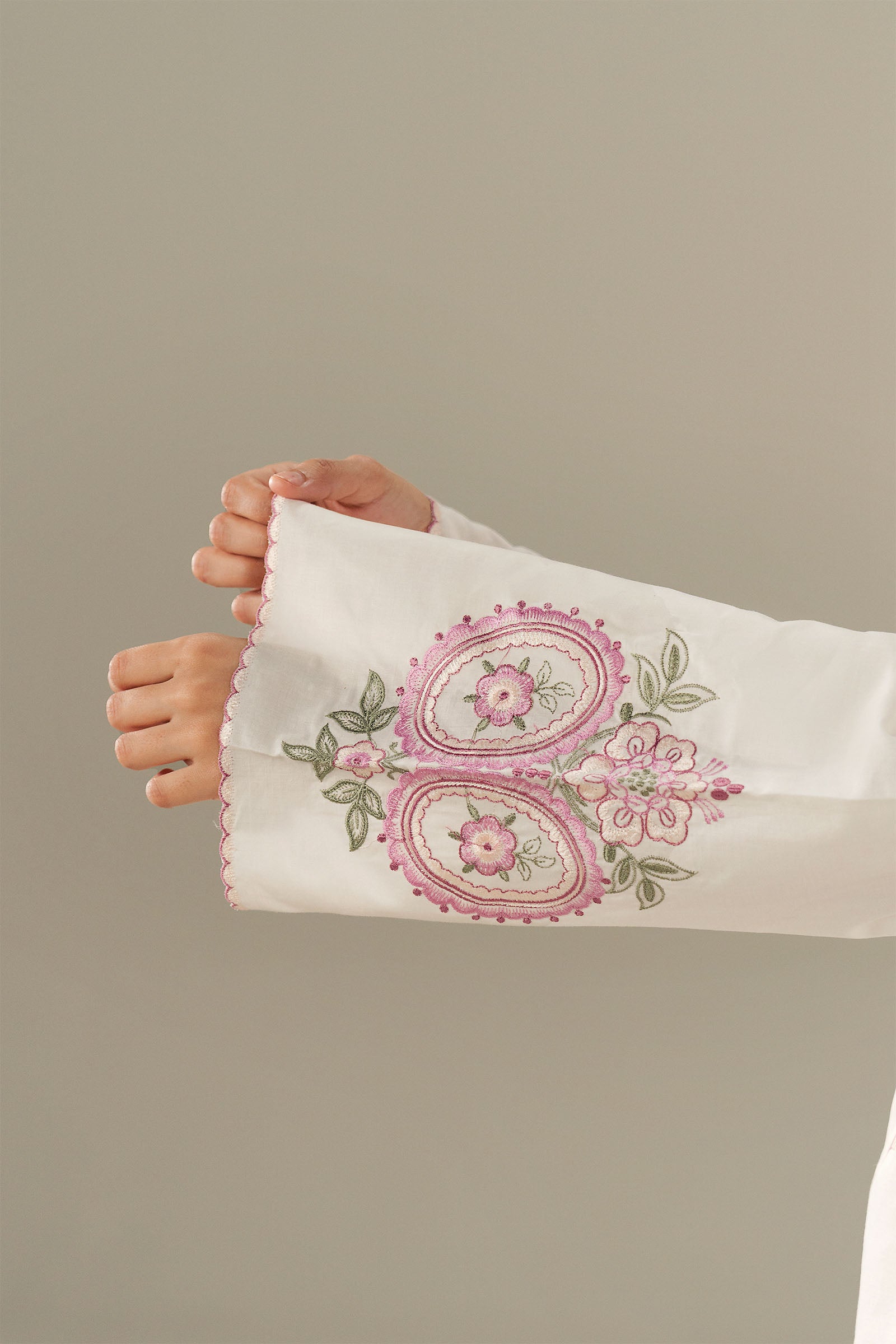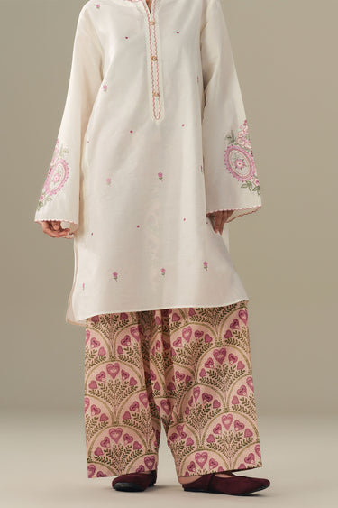 Fresh, clean, but far from basic. This classic white shirt gets a subtle upgrade with delicately embroidered sleeves, paired with a printed farshi shalwar that adds just the right amount of movement and contrast. Easy, elevated, and styled to stand out without trying too hard."