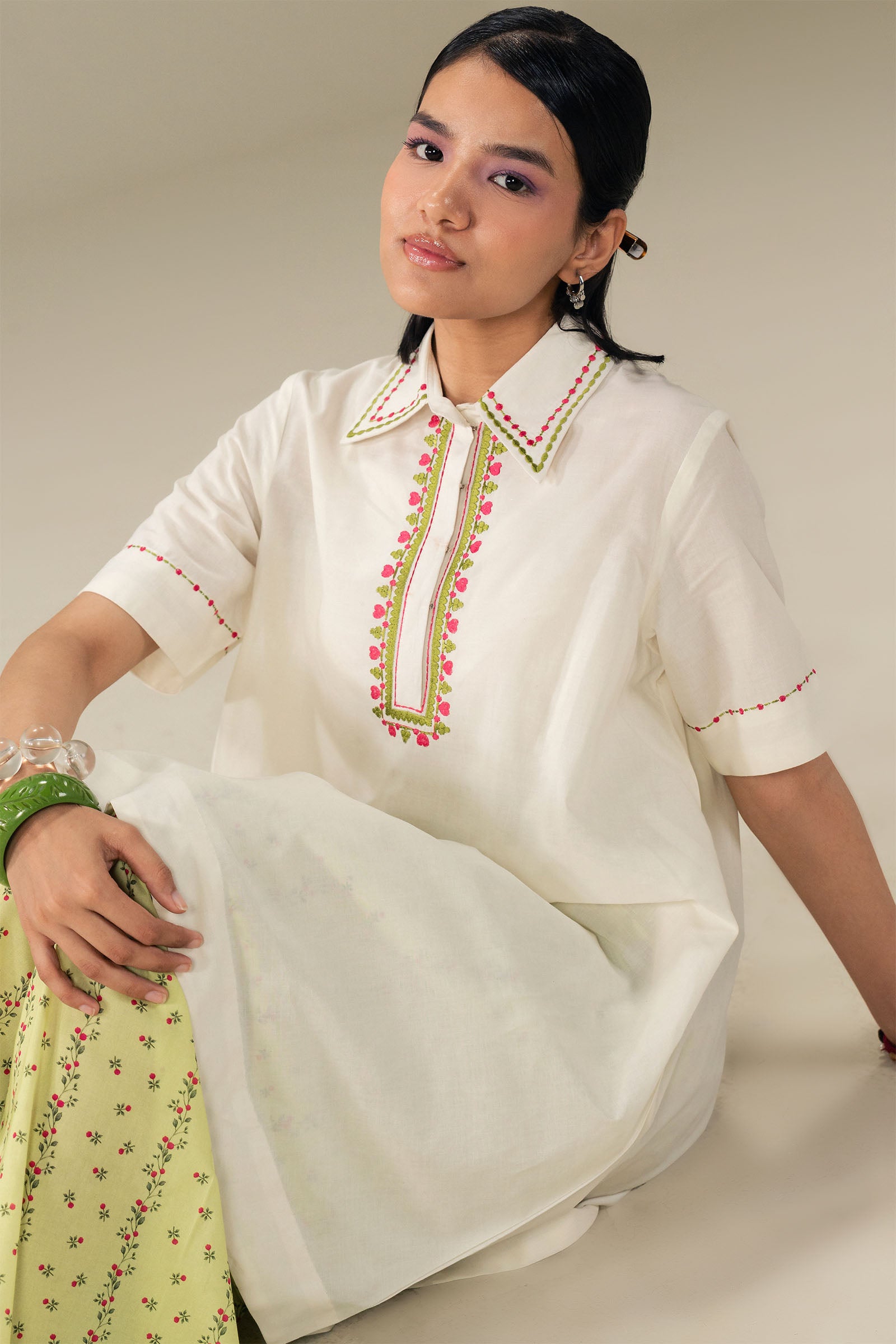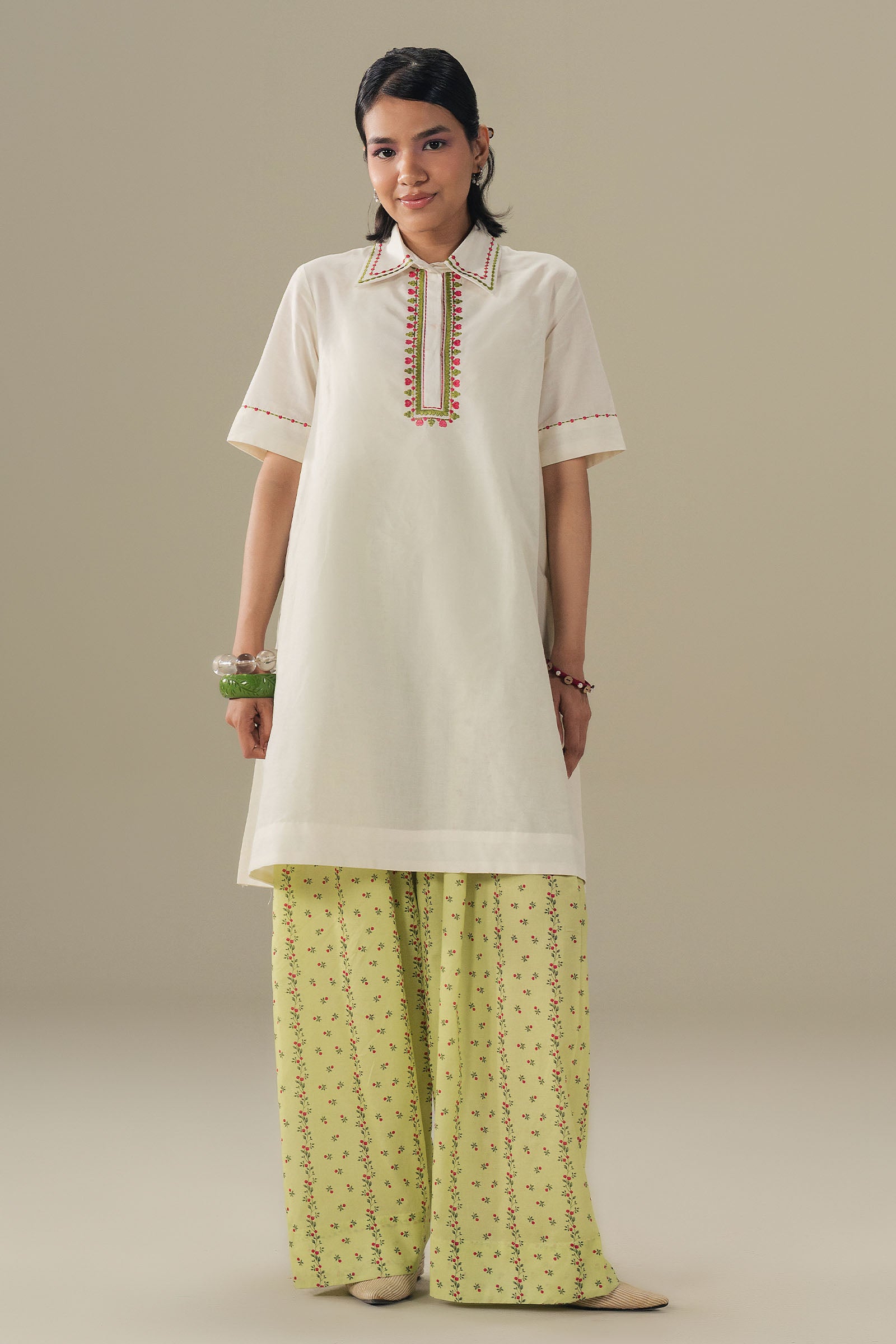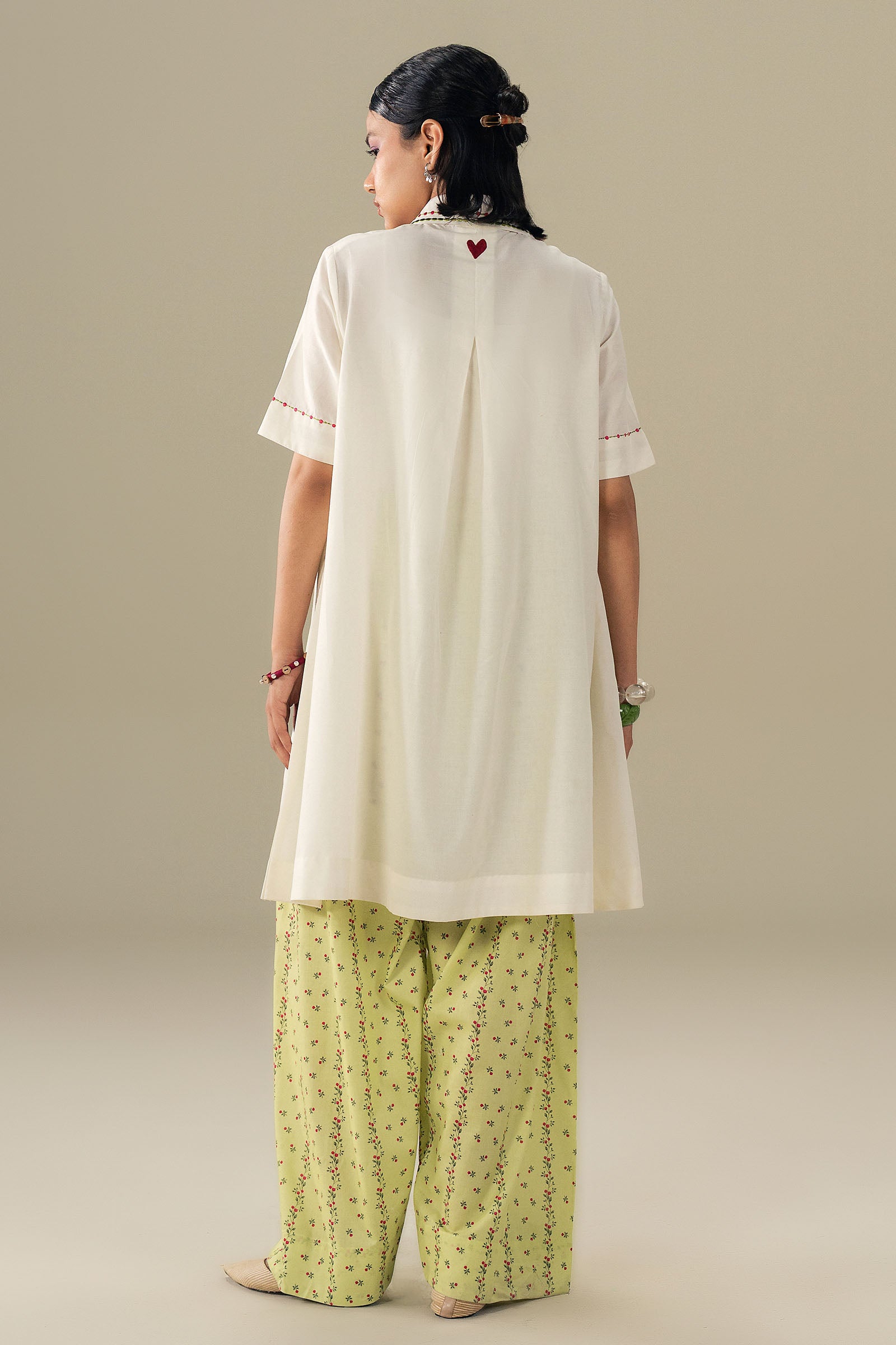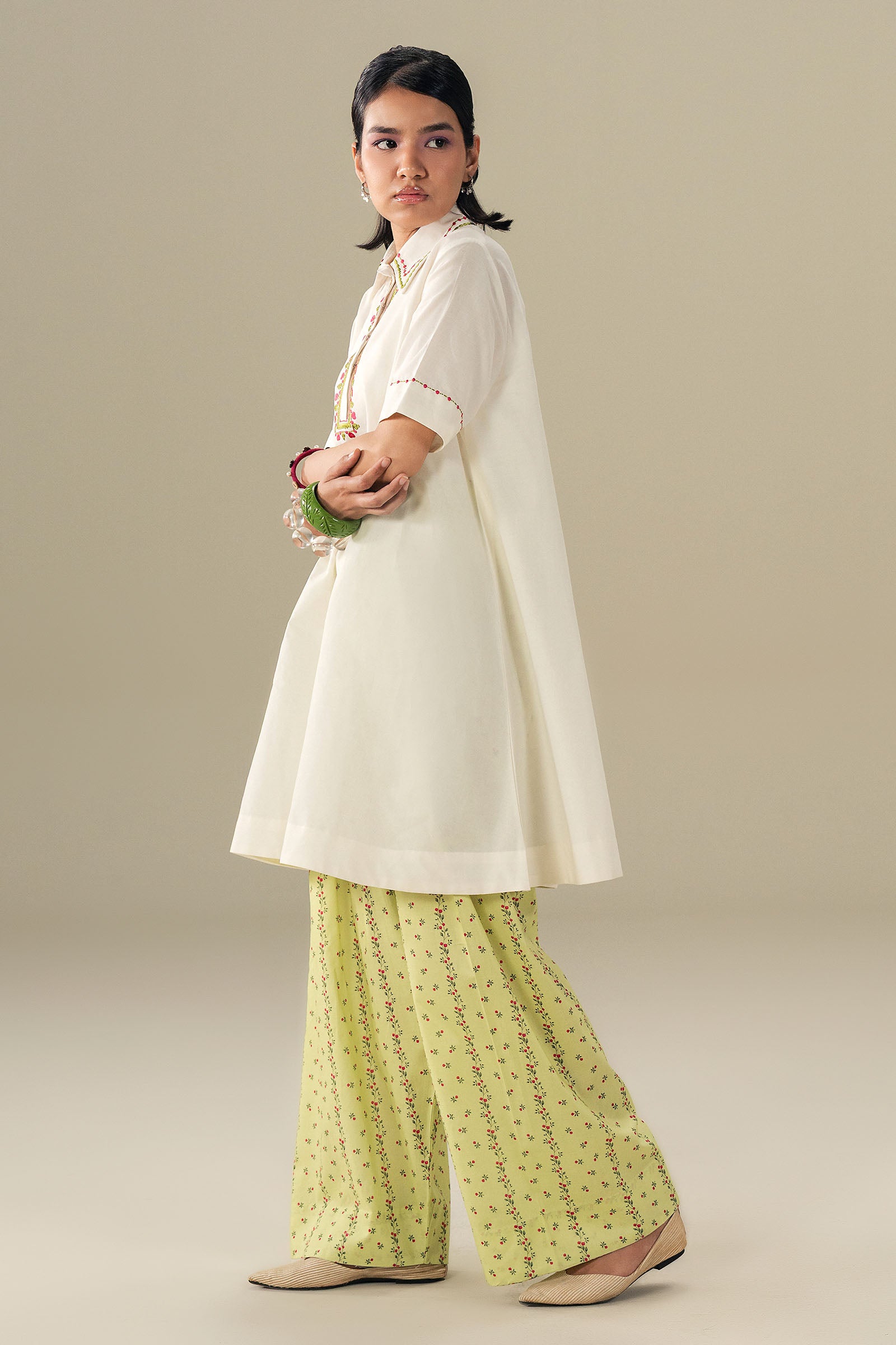 Crisp, fresh, and effortlessly chic. This short white kurta features delicate embroidery on the sleeves and neckline, paired with a printed farshi shalwar for a soft, flowing silhouette. Light, modern, and perfect for days when ease meets style.