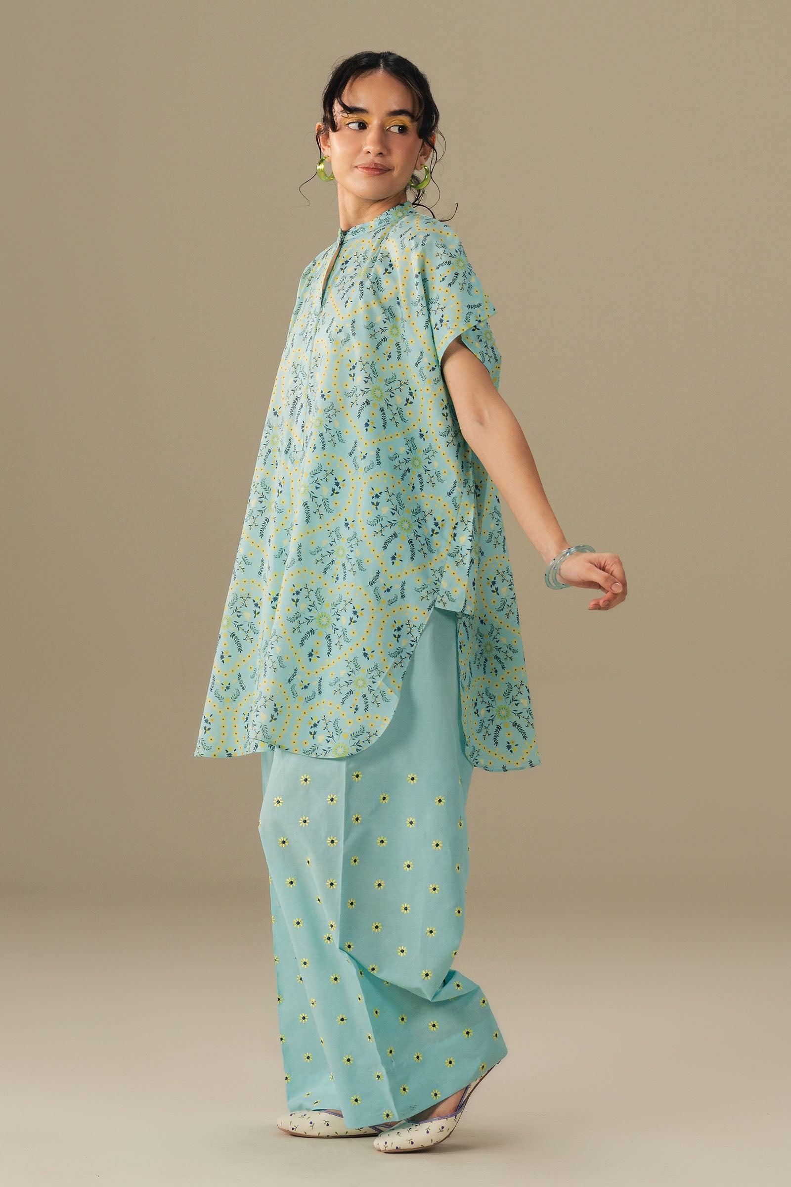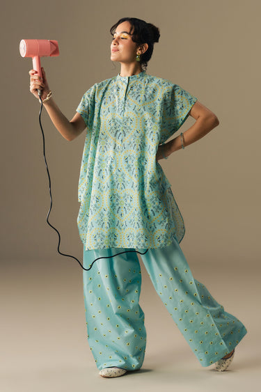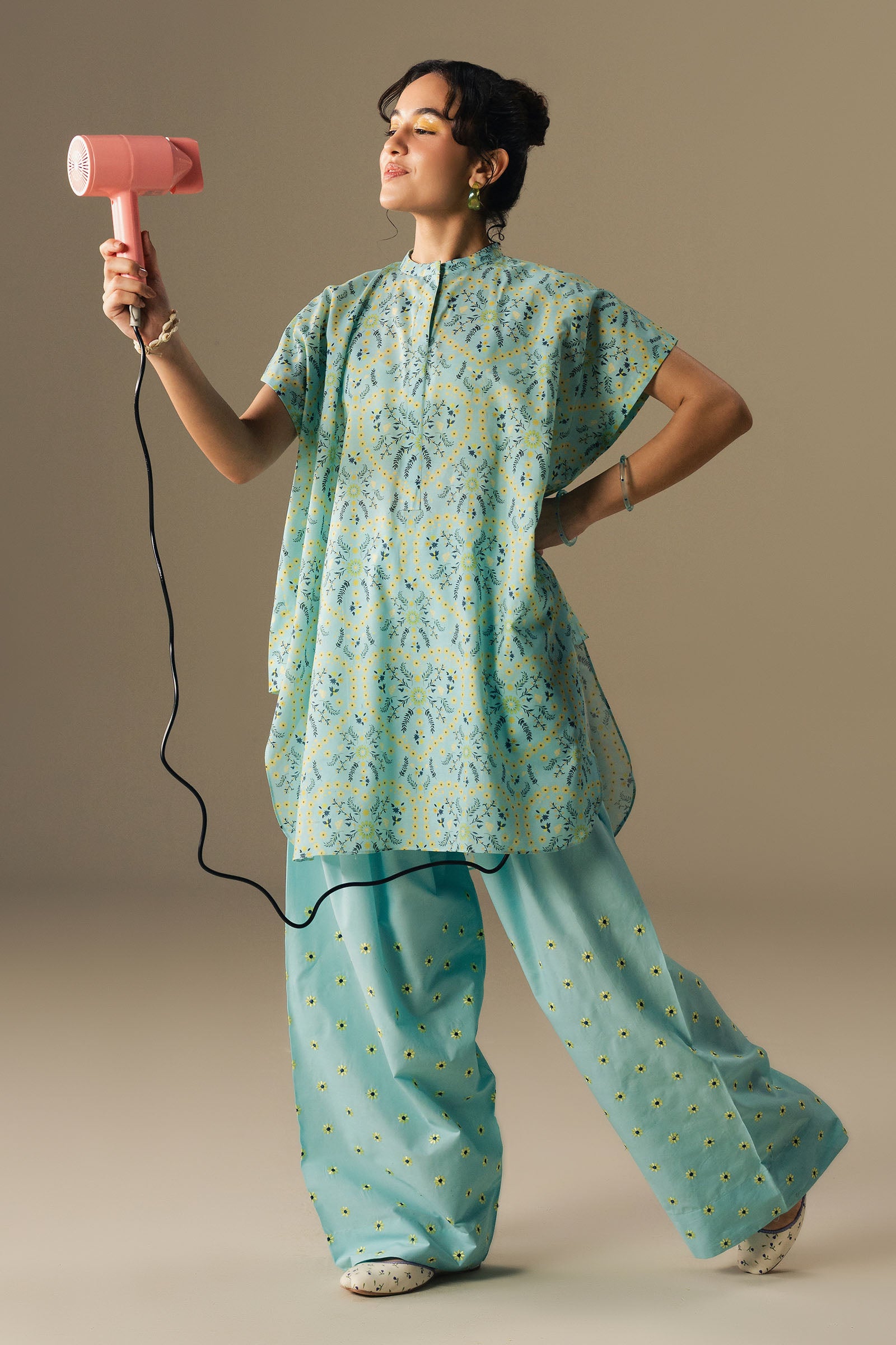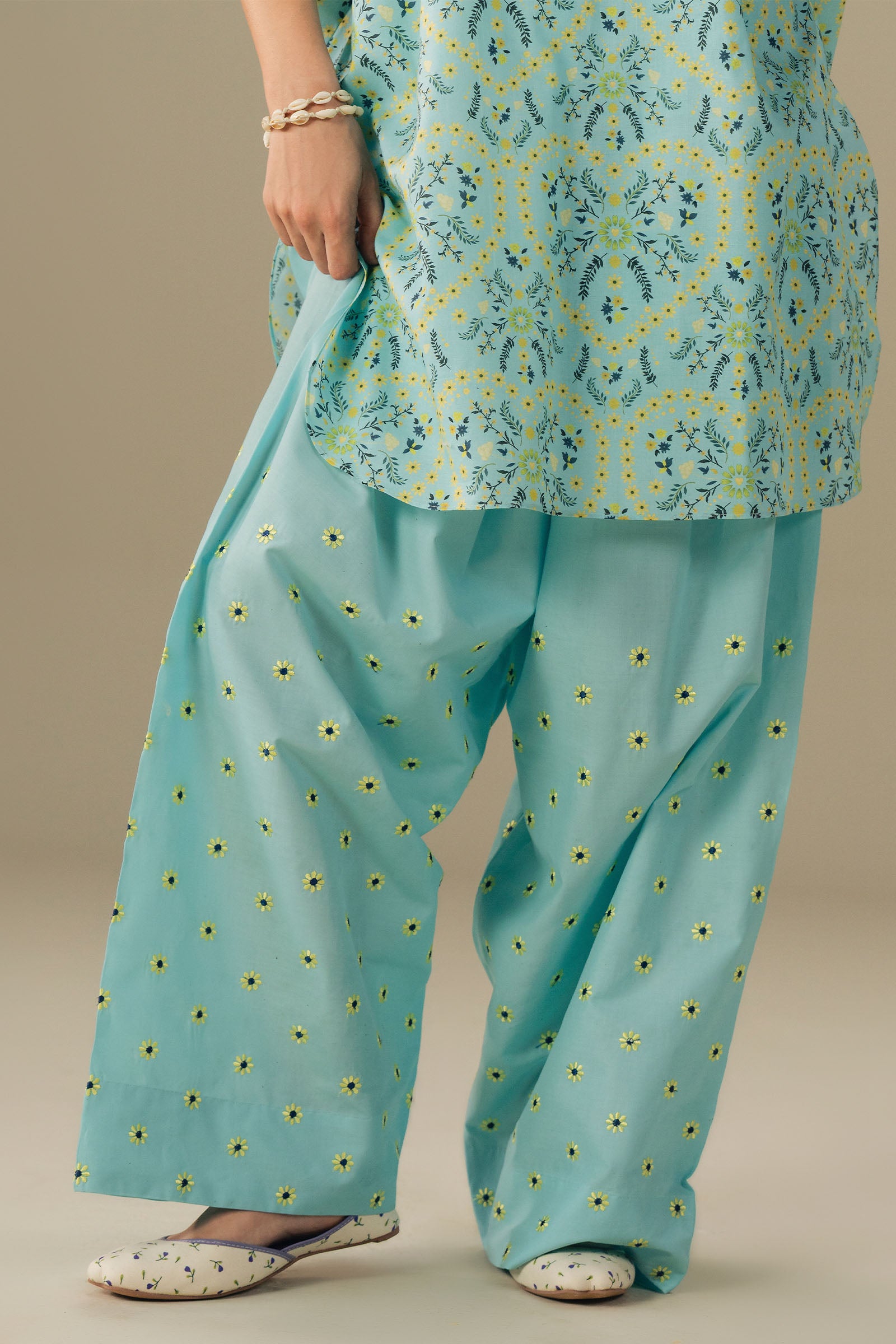 Oversized, relaxed, and effortlessly chic. This printed kurta with dropped shoulders is paired with an embroidered shalwar, blending comfort with statement-making details. Bright, modern, and full of effortless energy.