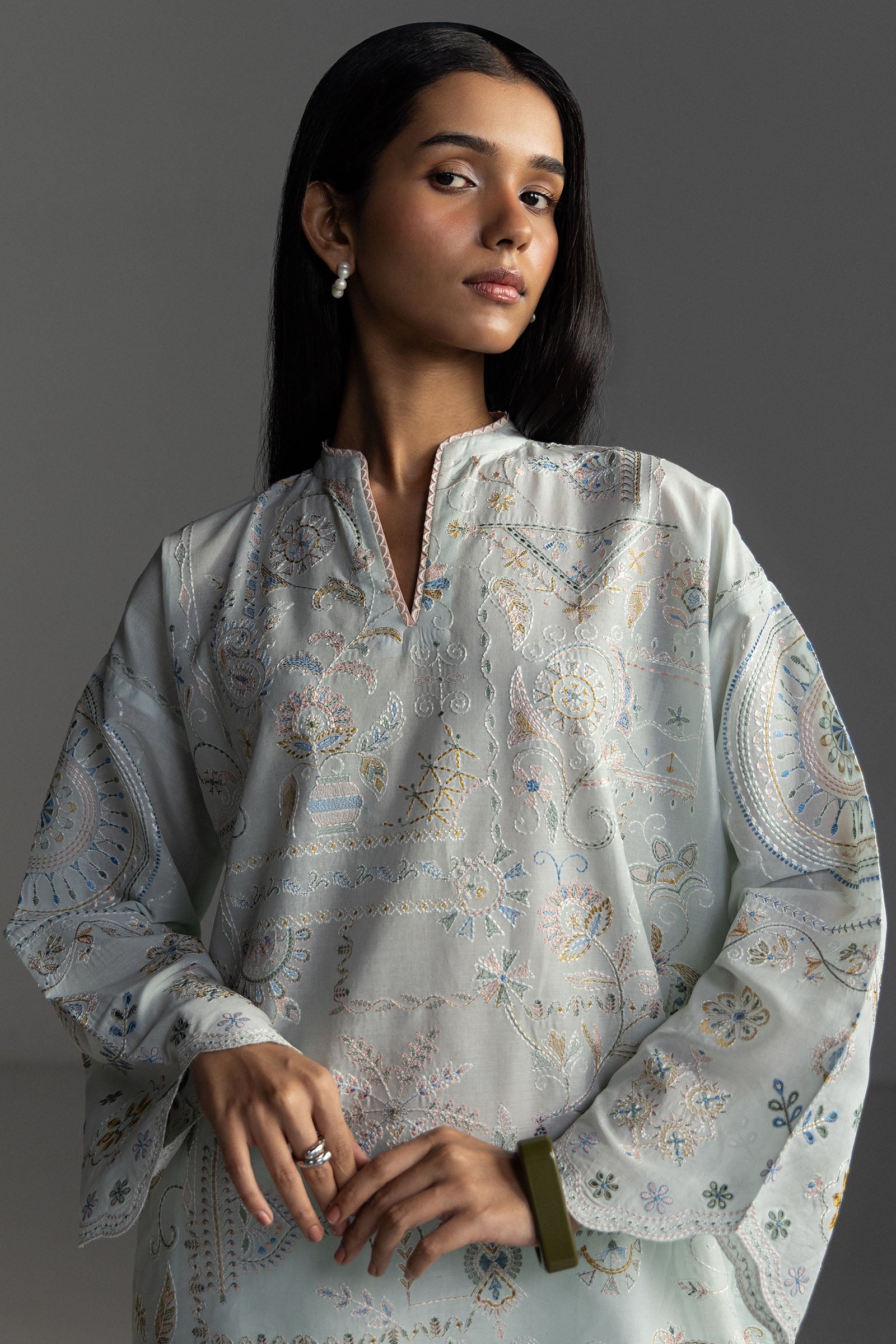 An ice blue shirt with kantha embroidery, paired with a dyed ice blue trouser, and finished with a printed tea rose pink dupatta for a serene and graceful look.
